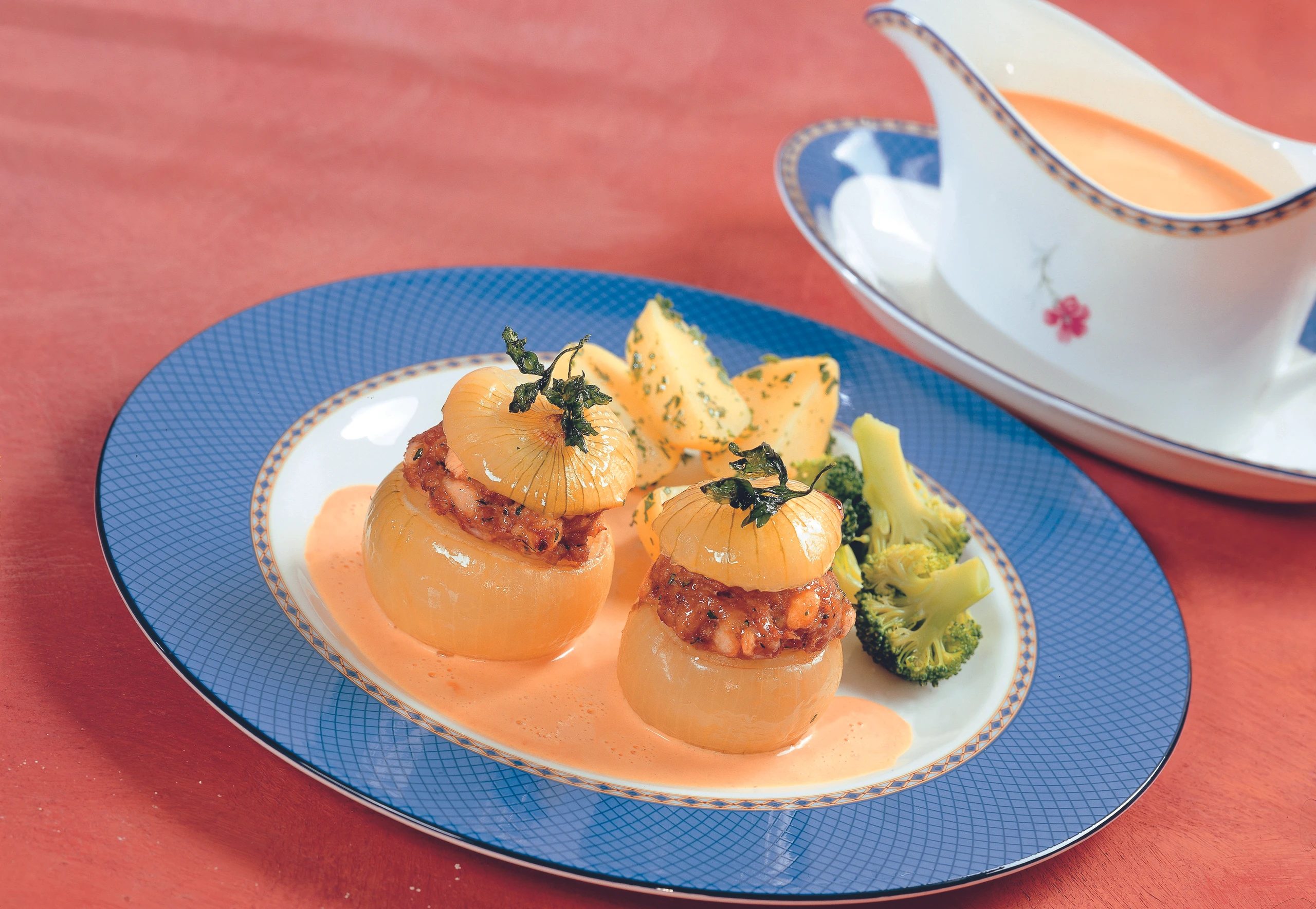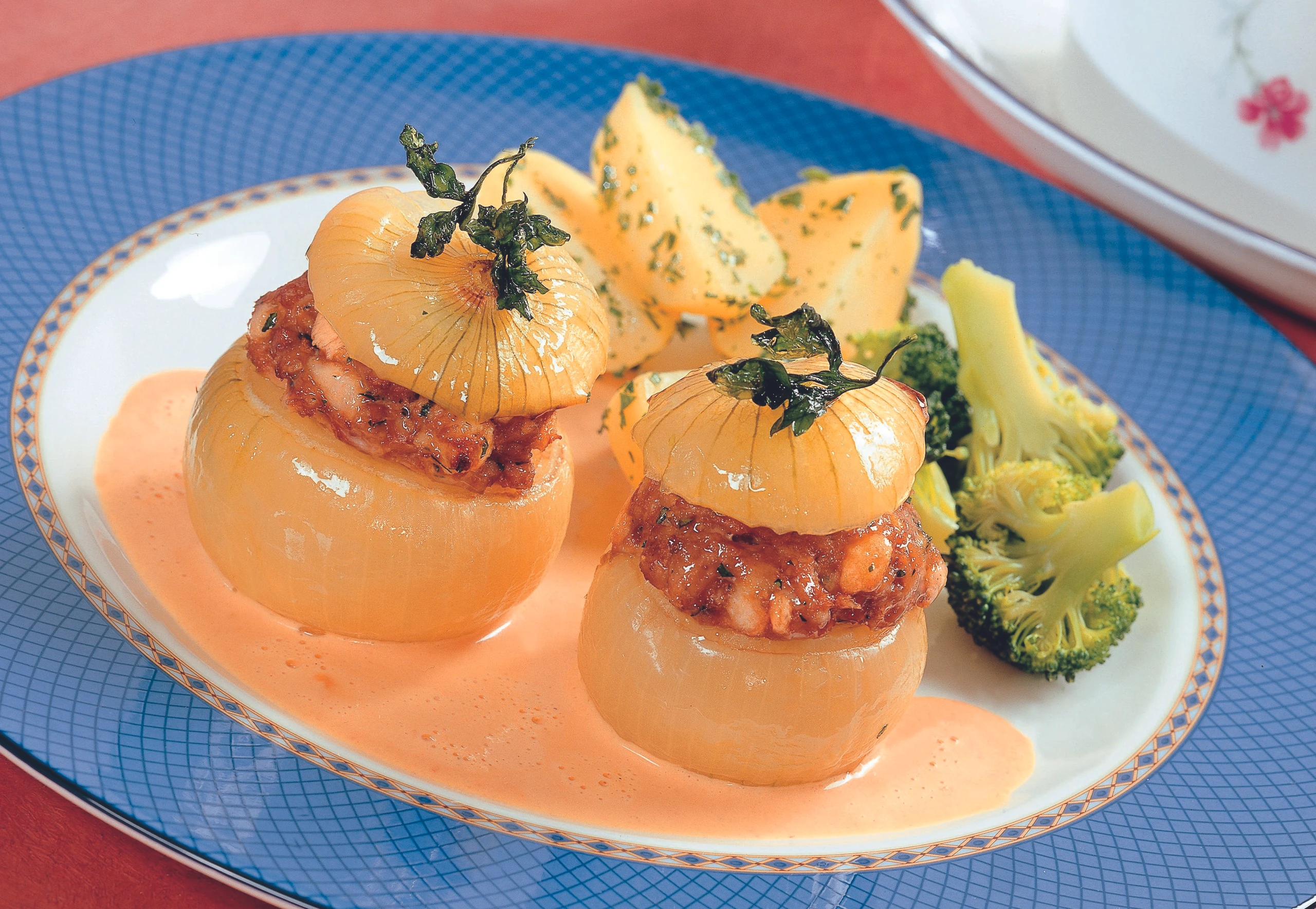 Zwiebeln in Eiswasser abschrecken und gut abtropfen lassen. Die Kappen der Zwiebeln abschneiden und beiseite legen. Die inneren Schichten behutsam mit den Fingern herausdrücken (es soll eine ca. 1/2 cm dicke Wand stehen bleiben). Zwiebeln mit der Öffnung nach unten auf einem Tuch abtropfen lassen. Das herausgelöste Innere der Zwiebeln klein würfelig schneiden und für die Sauce beiseite legen.