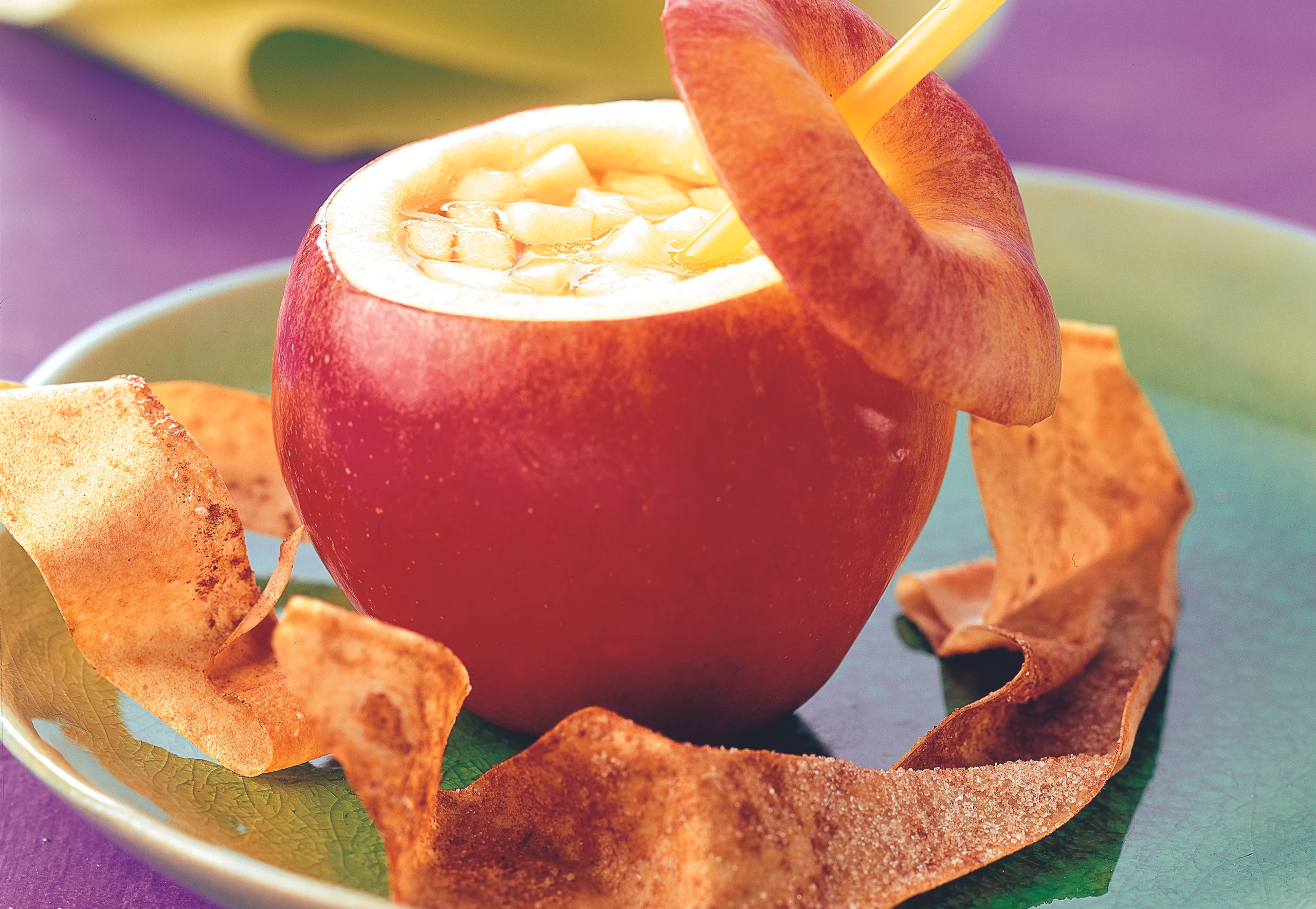 Zum Anrichten die Deckel auf die Äpfel setzen, durch das Loch im Deckel einen Strohhalm stecken.