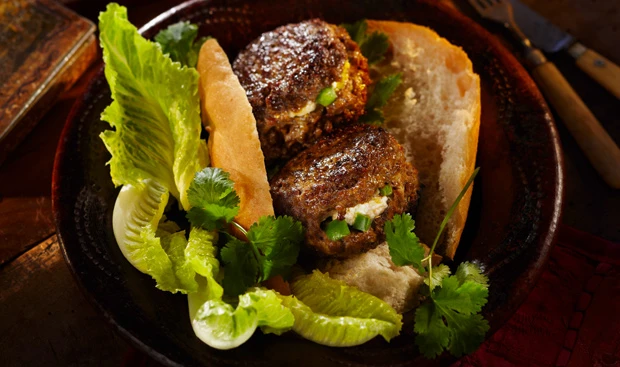 Kebab behutsam aus der Pfanne nehmen, auf Küchenpapier abtropfen lassen mit Salat und Fladenbrot servieren.