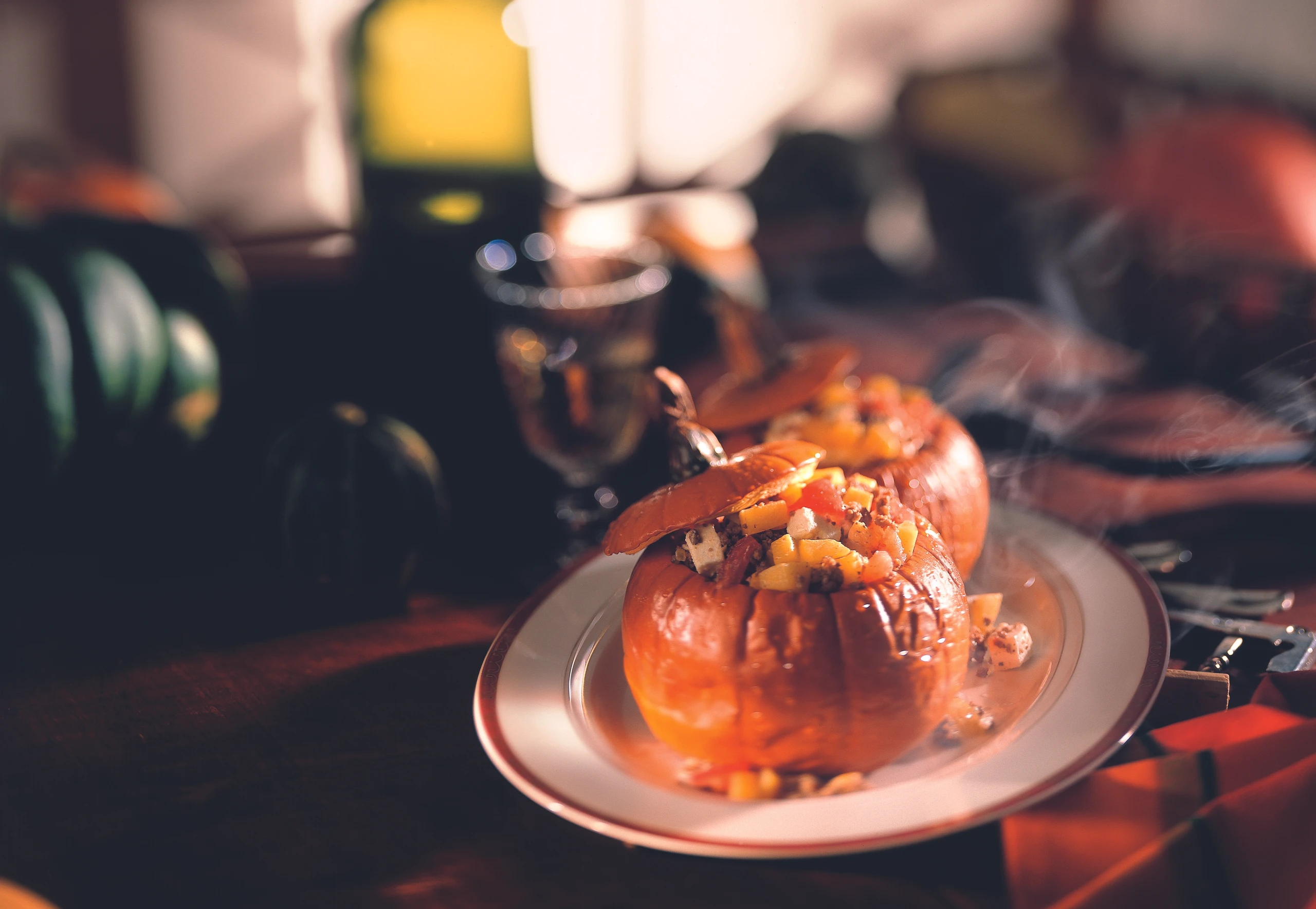 Kürbisragout eventuell mit Salz und Pfeffer nachwürzen und in den vorgewärmten Kürbissen servieren. Sollte vom Ragout etwas übrig bleiben, kann man es warm stellen und später als Nachschlag reichen.