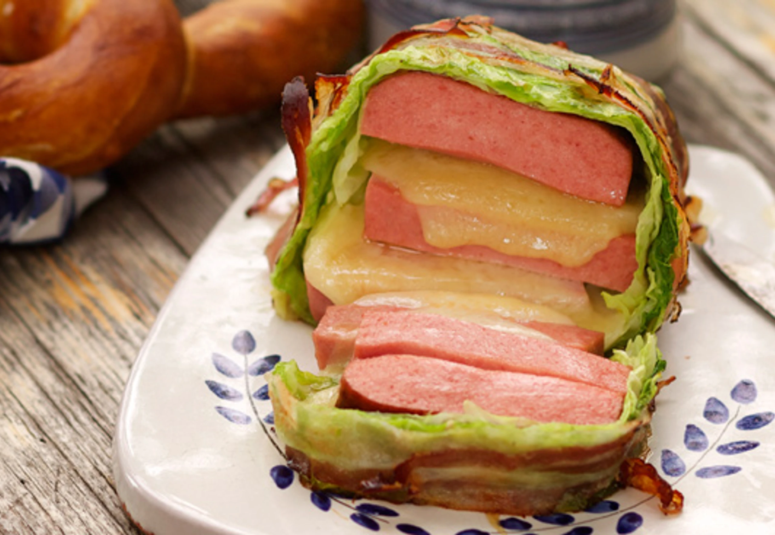 - Leberkäse mit Kohlblättern umwickeln. Speckstreifen darüber schlagen.