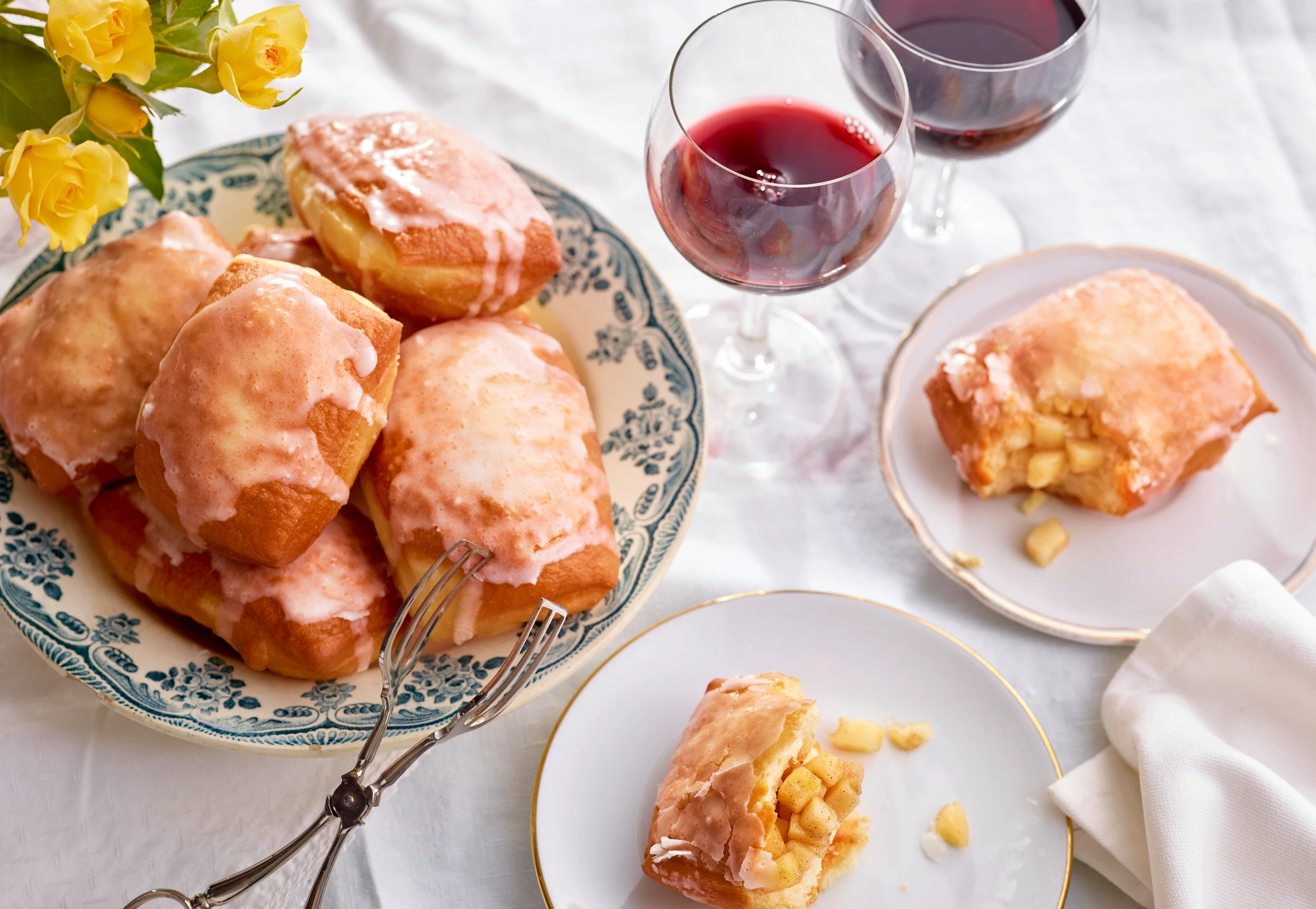 Teig auf einer leicht bemehlten Arbeitsfläche ausrollen und in 24 Rechtecke (8 x 6 cm) schneiden. Auf der Hälfte der Rechtecke jeweils 1 TL Apfelfülle verteilen. Mit den restlichen Rechtecken belegen. Ränder mit einem Messerrücken gut andrücken.