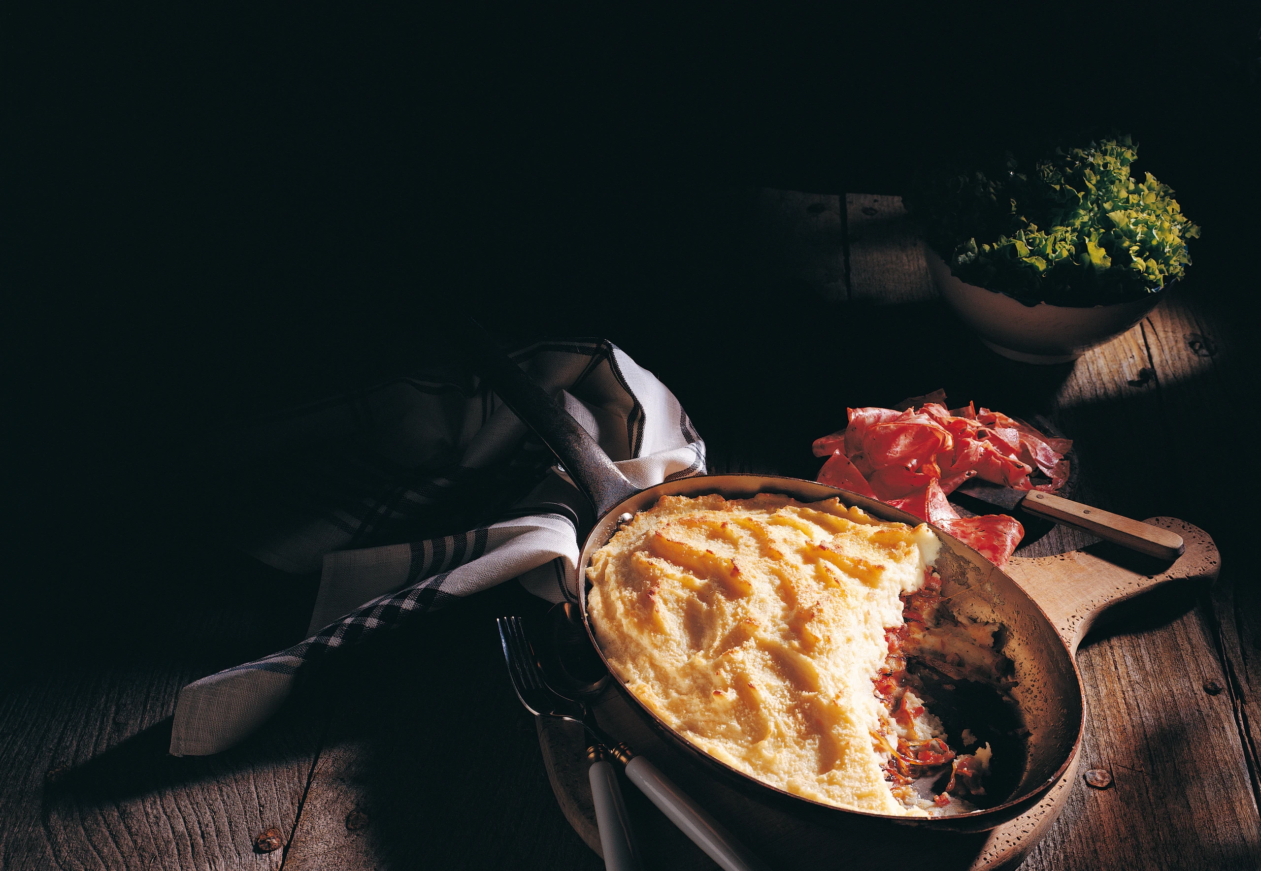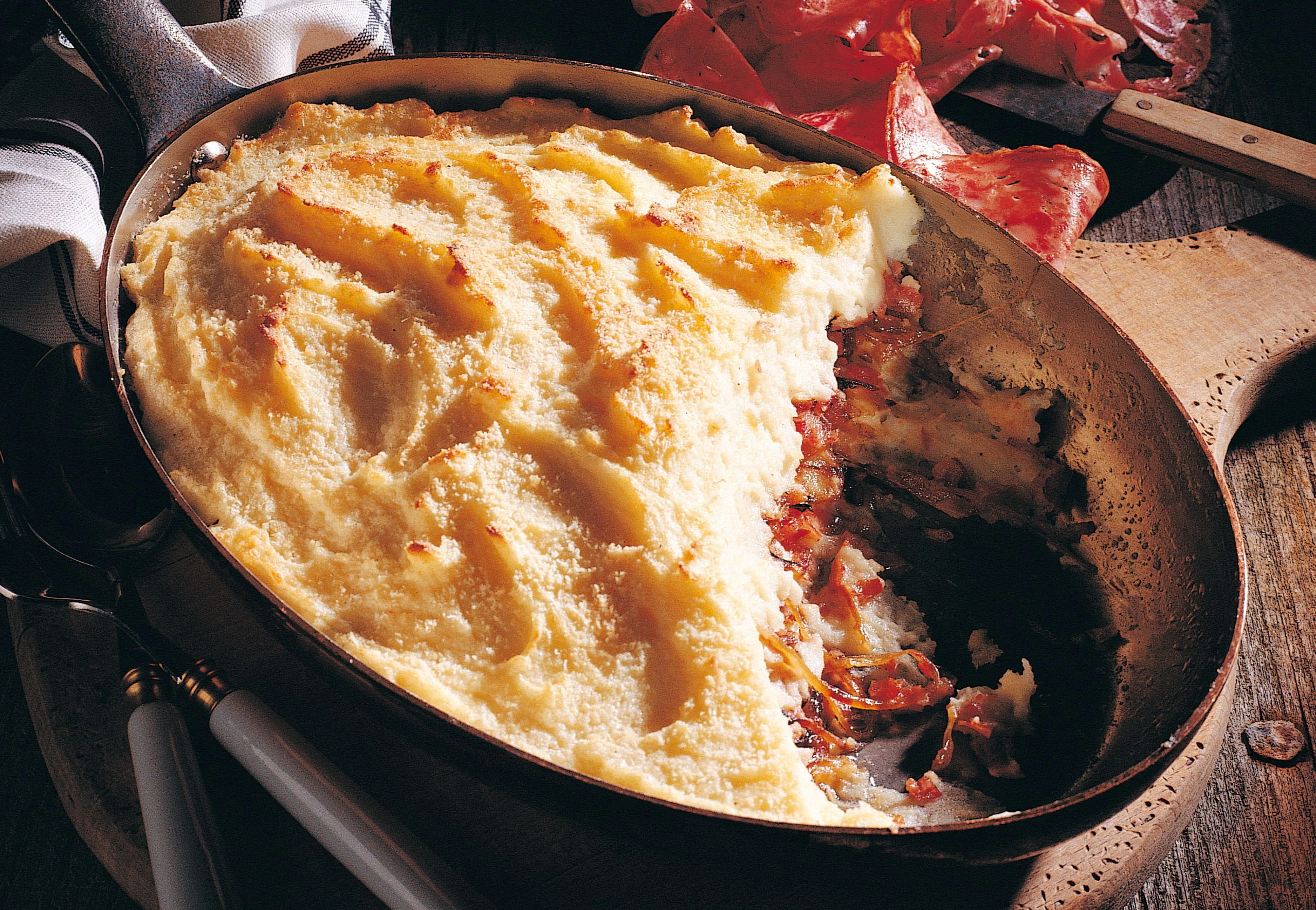 Milch erwärmen, Butter darin schmelzen. Erdäpfel abseihen, gut abtropfen lassen und noch heiß durch eine Erdäpfelpresse drücken. Milch untermischen und die Masse mit Salz, Pfeffer und geriebener Muskatnuß würzen. Backrohr auf 200 °C vorheizen.