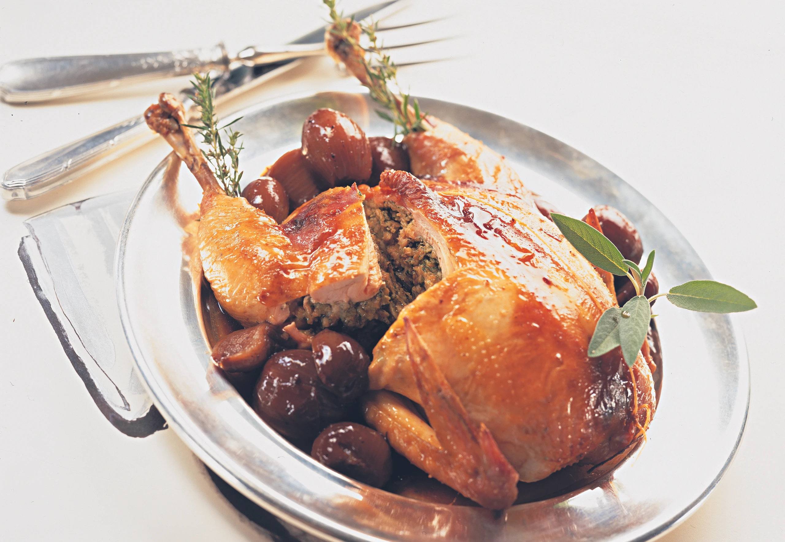 Gefülltes Maishendl mit Rotwein-Zwiebeln