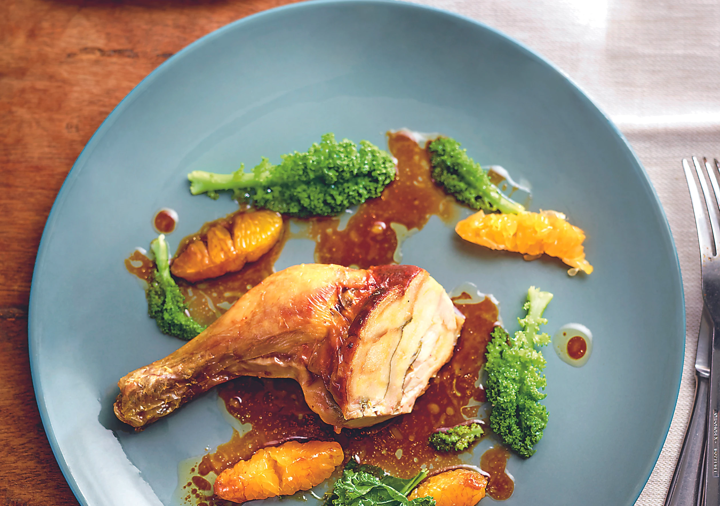 Für die Sauce Schalotten schälen und in Scheiben schneiden, Speck klein würfeln, in einem flachen Bräter in 2 EL Öl anbraten. Mit Essig ablöschen, mit Hühner- und Kalbsfond sowie Mandarinensaft aufgießen. Mandarinenschale einrühren.