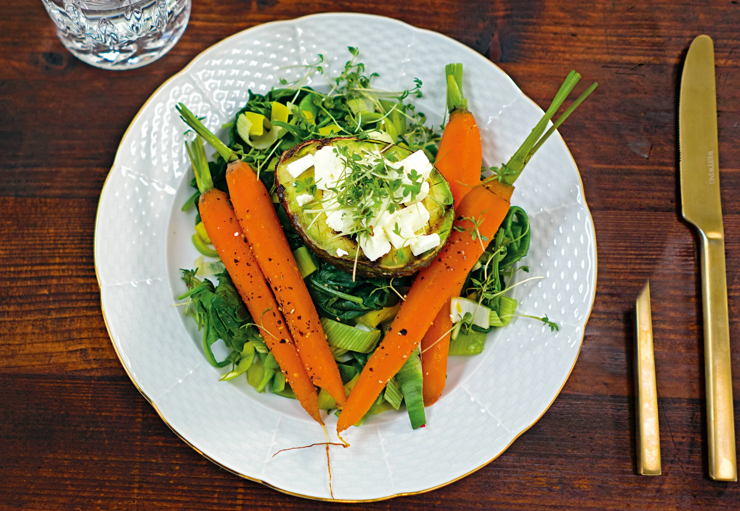Spinat, Lauch, Karotten und Avocados anrichten, pfeffern und mit Kresse bestreuen.