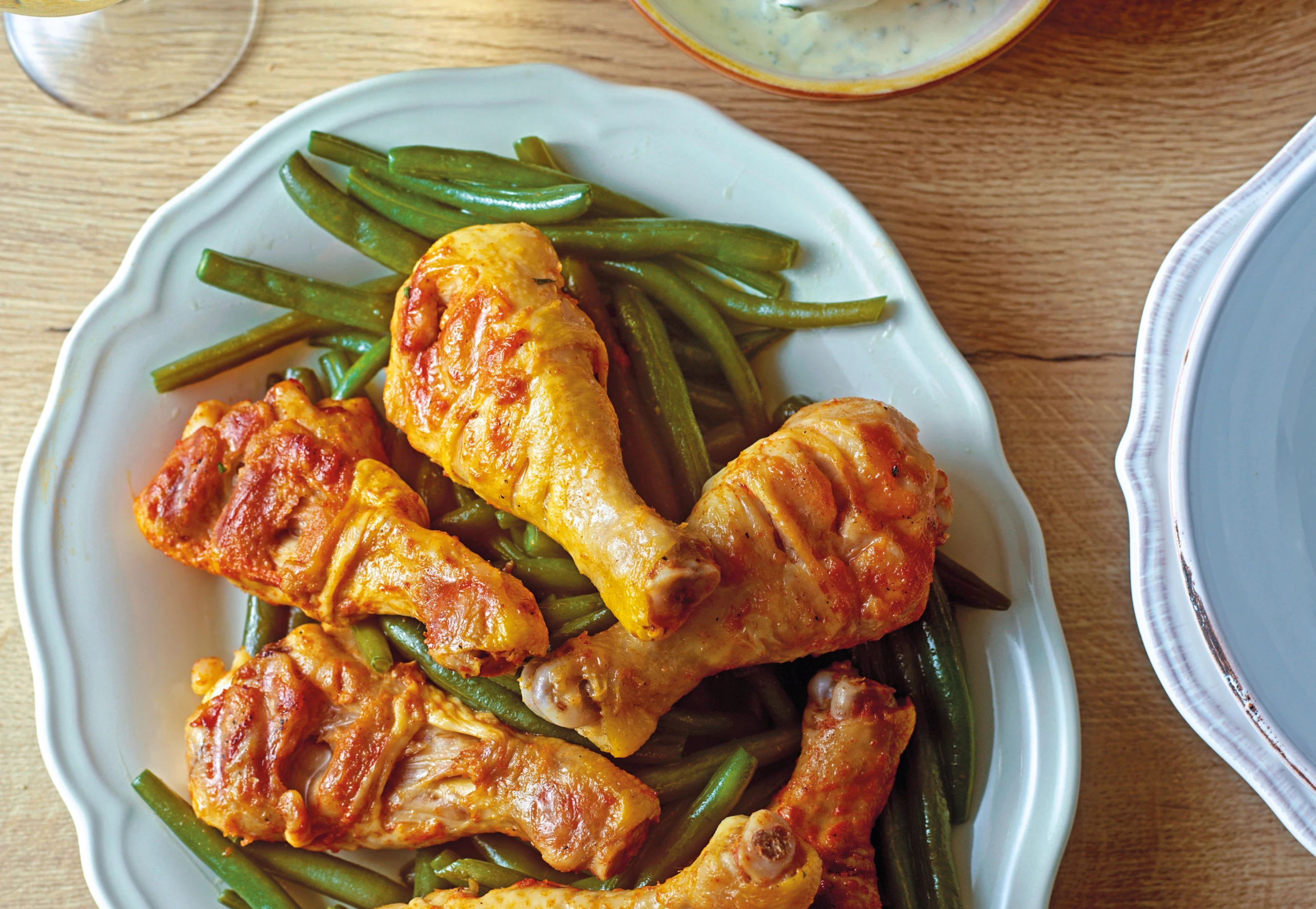 Butter bis zum Aufschäumen erhitzen, Thymian und Fisolen darin schwenken. Salzen und pfeffern. Keulen mit Fisolen und Mayo anrichten.