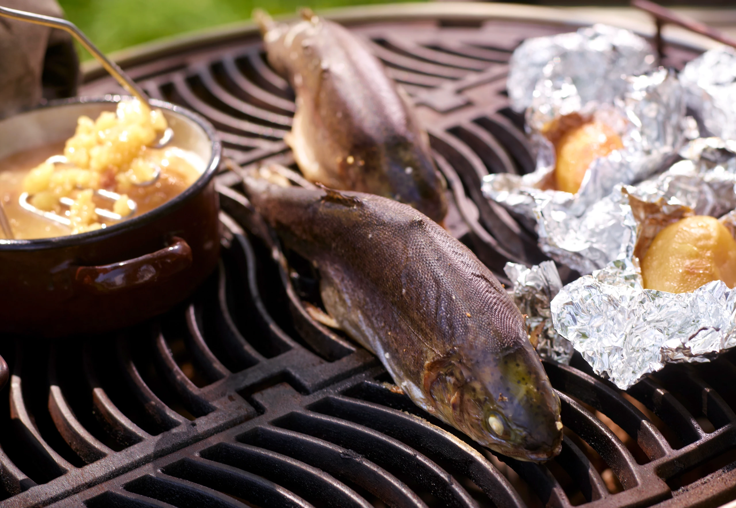 Forellen auf den Grill setzen und indirekt ca. 18 Minuten grillen (geschlossener Deckel). Der Fisch ist gar, wenn die Augen weiß sind und die Haut spannt.