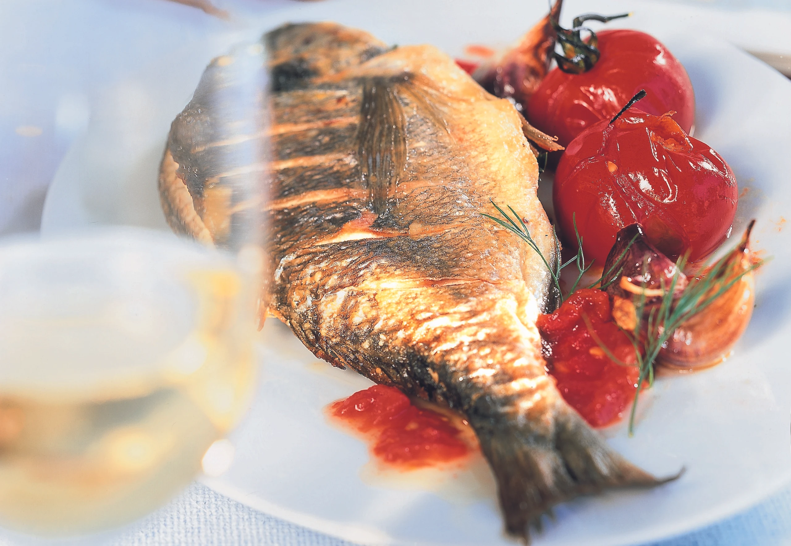 Gegrillte Goldbrasse mit Knoblauch und Paradeisern