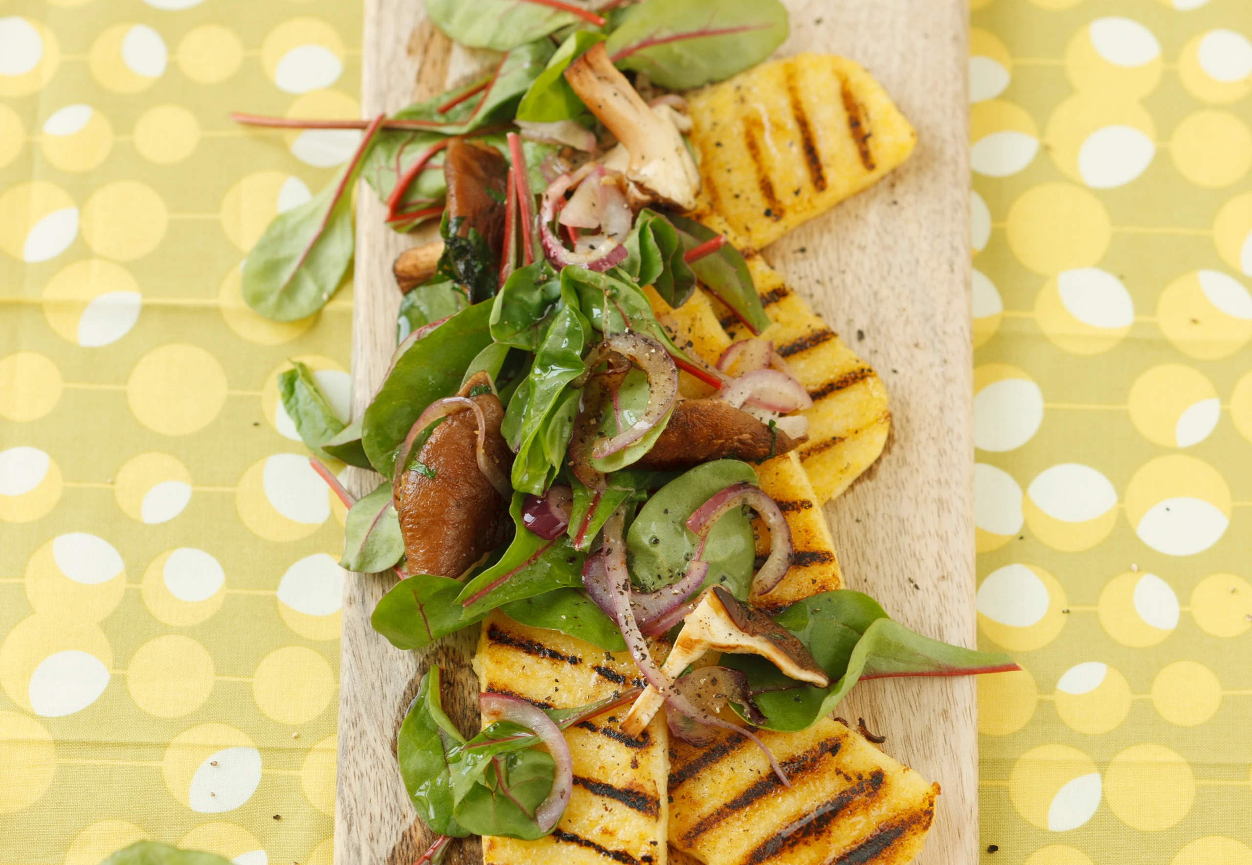 Polentascheiben mit Mangold und Pilzen anrichten. Eventuell zusätzlich mit wenig Zitronensaft und Öl beträufeln.