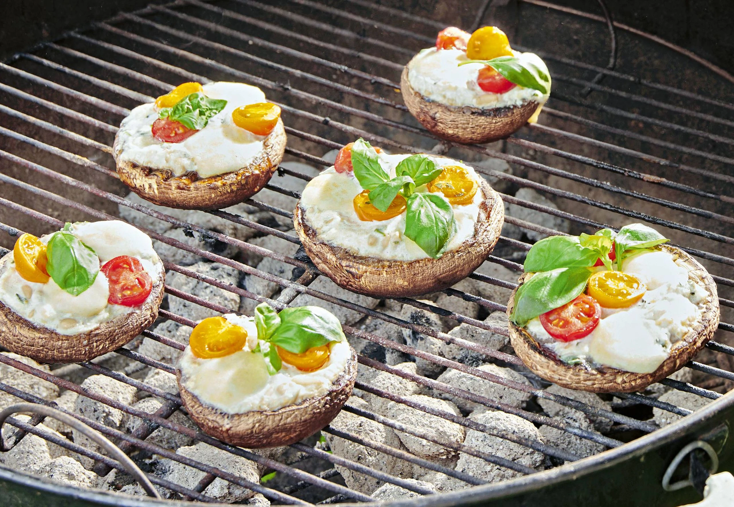 Portobellos mit der Creme bestreichen. Paradeiser halbieren und mit dem Mozzarella darauf verteilen. Portobellos auf den Grill legen, zudecken und 15–20 Minuten grillen, bis der Käse geschmolzen ist. Portobellos mit Basilikum garnieren.