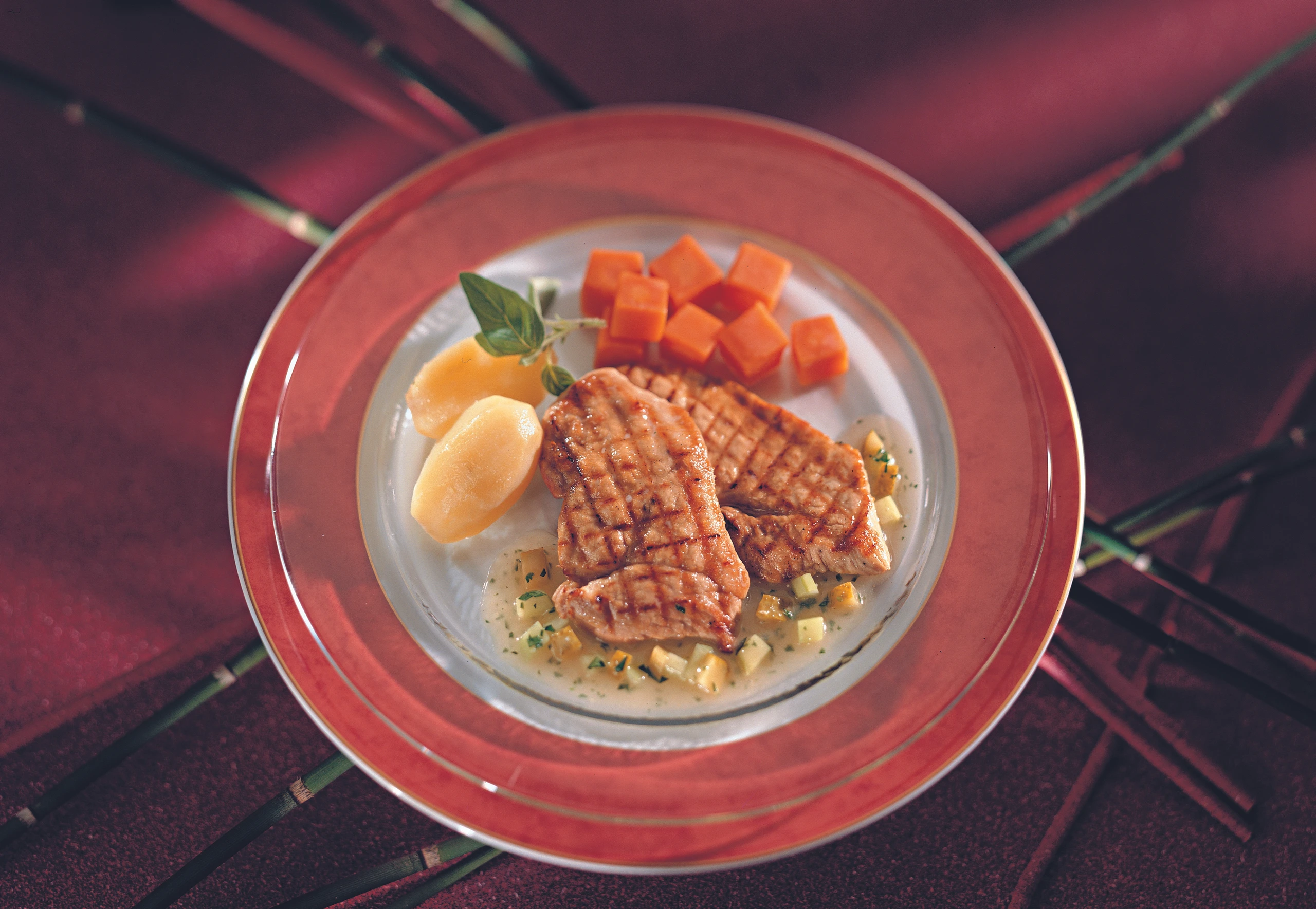 Gegrillte Schweinsschnitzel mit Gurken-Senf-Fond
