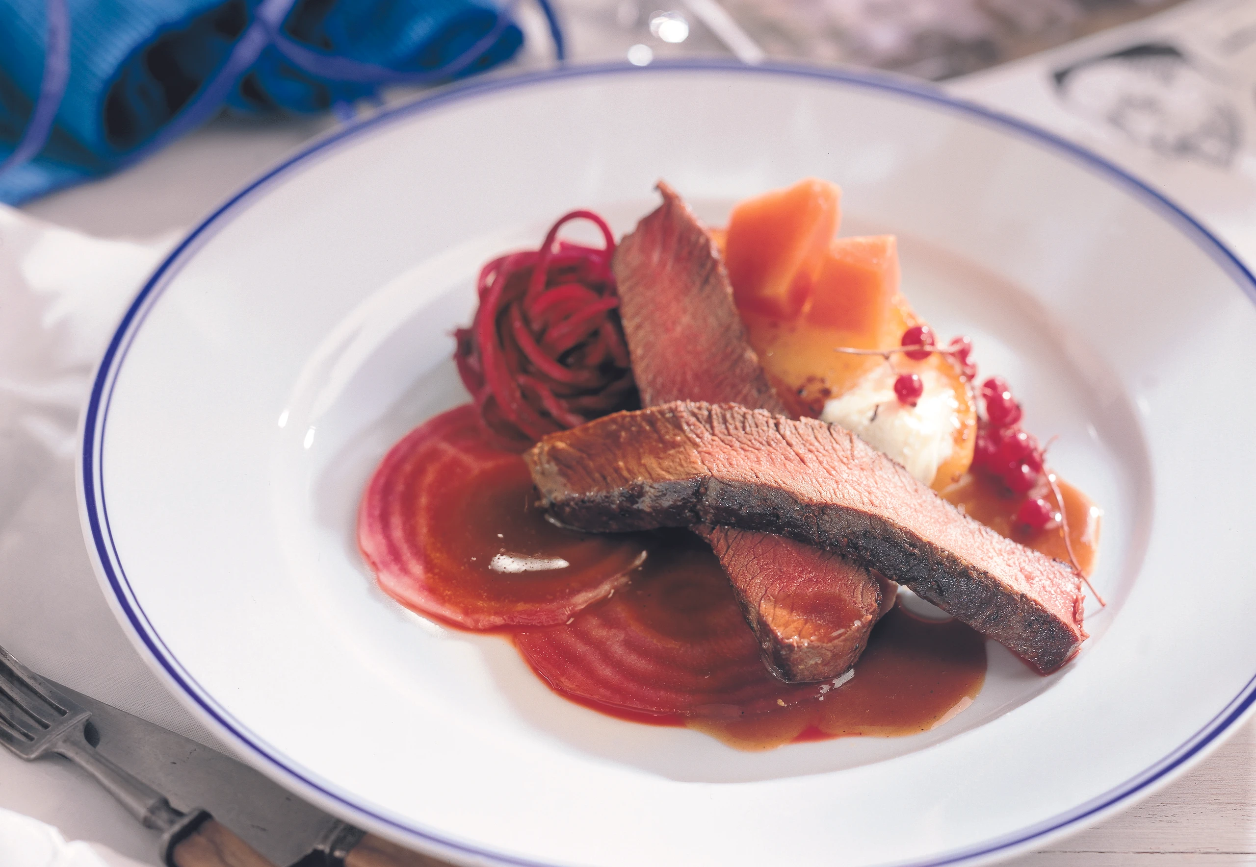 Gegrillter Hirschrücken Strindberg mit Erdäpfeln und marinierten Rüben