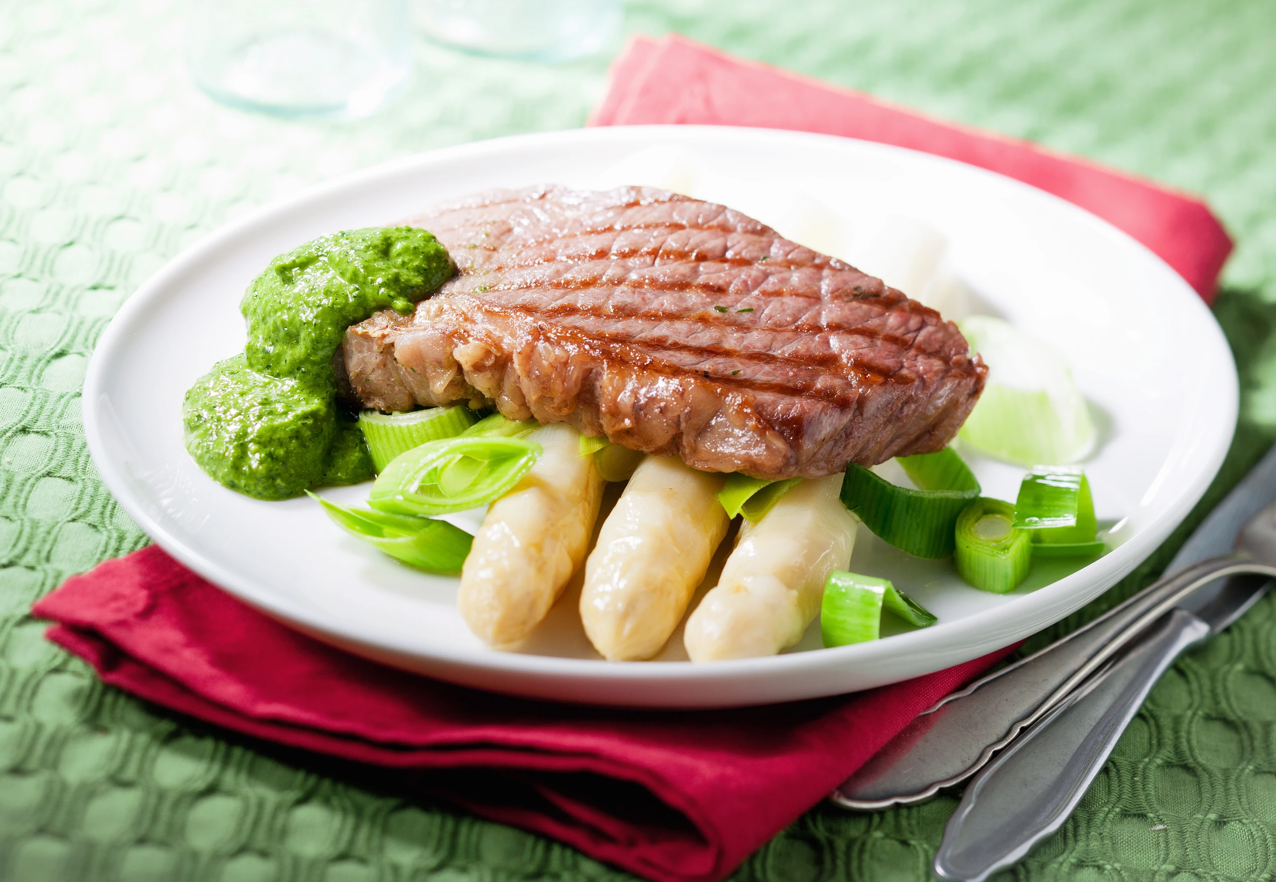 Gegrilltes Entrecôte mit Spargel und Salsa verde