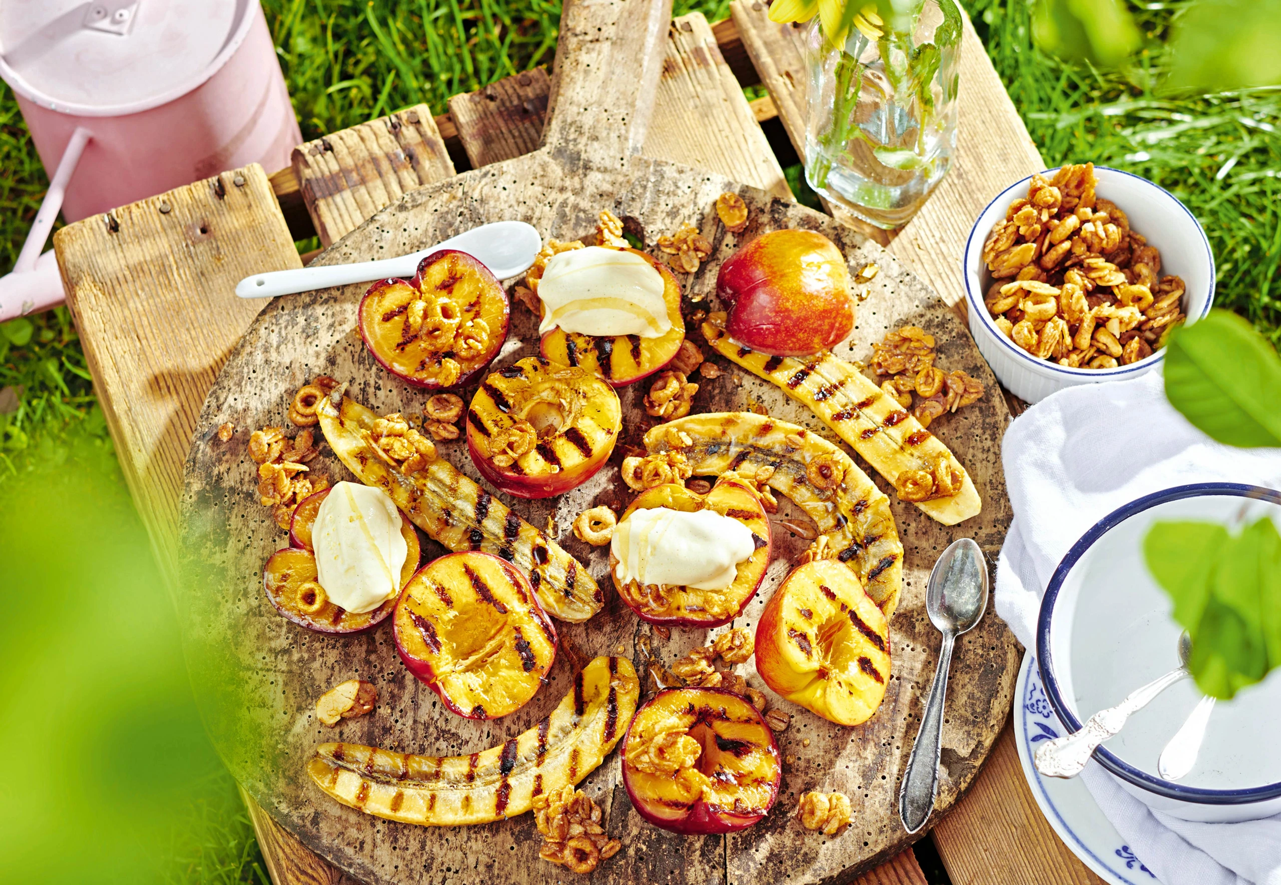 Obst halbieren, evtl. entkernen oder schälen. Obst von beiden Seiten grillen und noch heiß mit Vanilleeis, Crumble und frischer Minze genießen.