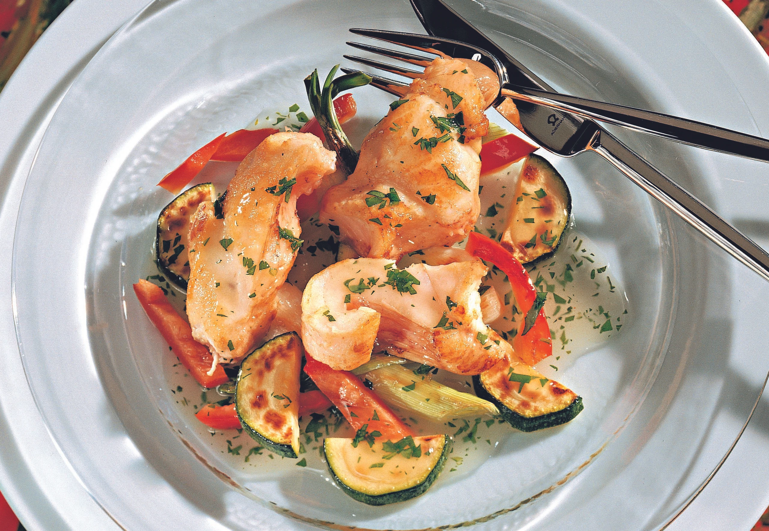 Stärkemehl mit wenig Wasser vermischen, mit den Paprikawürfeln in den Gemüsefond rühren und kurz aufkochen. Kräuter einrühren, Fond über das Gemüse gießen und den Fisch darauf anrichten.