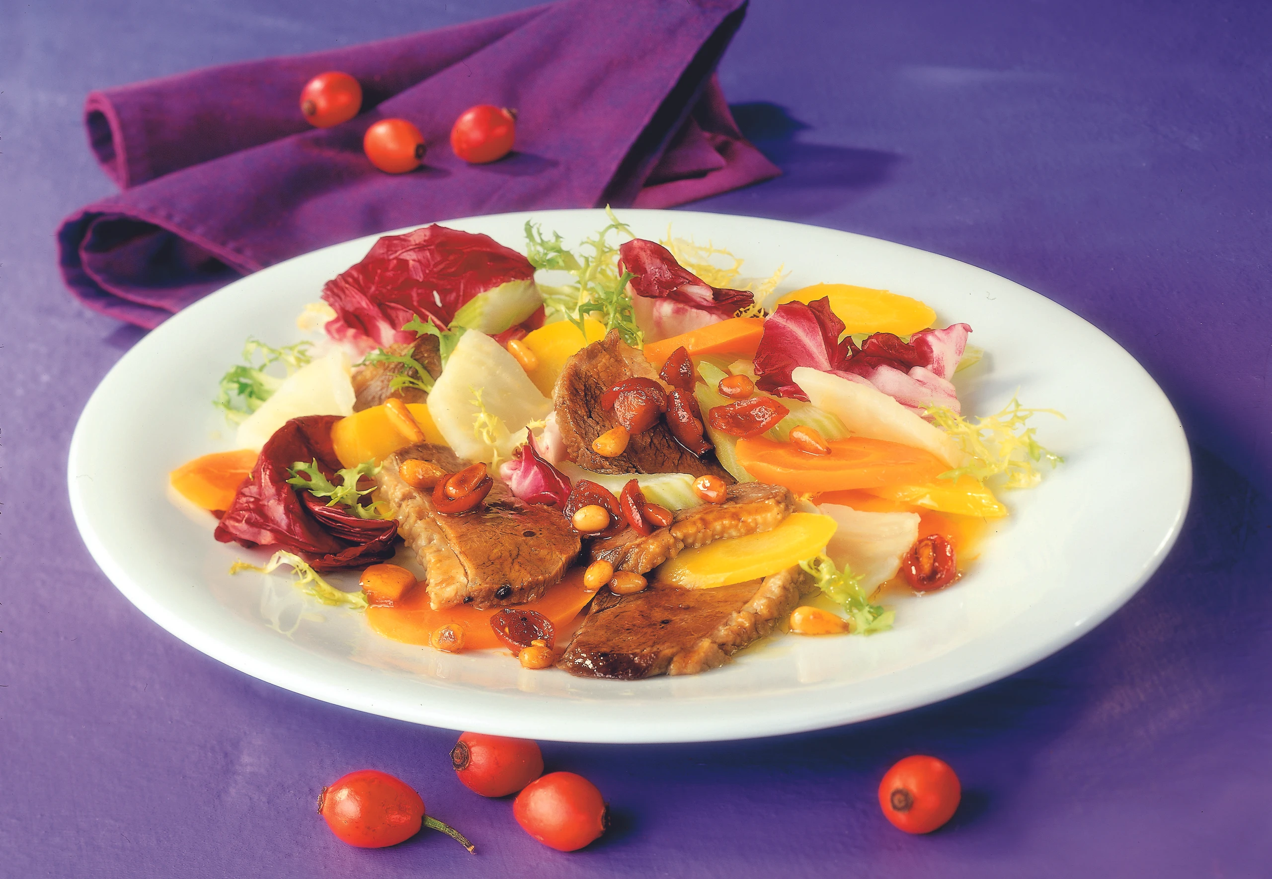 Gemüse und Salatblätter anrichten. Fleisch quer zur Faser in dünne Scheiben schneiden, darauf legen und mit Hagebutten-Apfel-Confit garniert servieren.