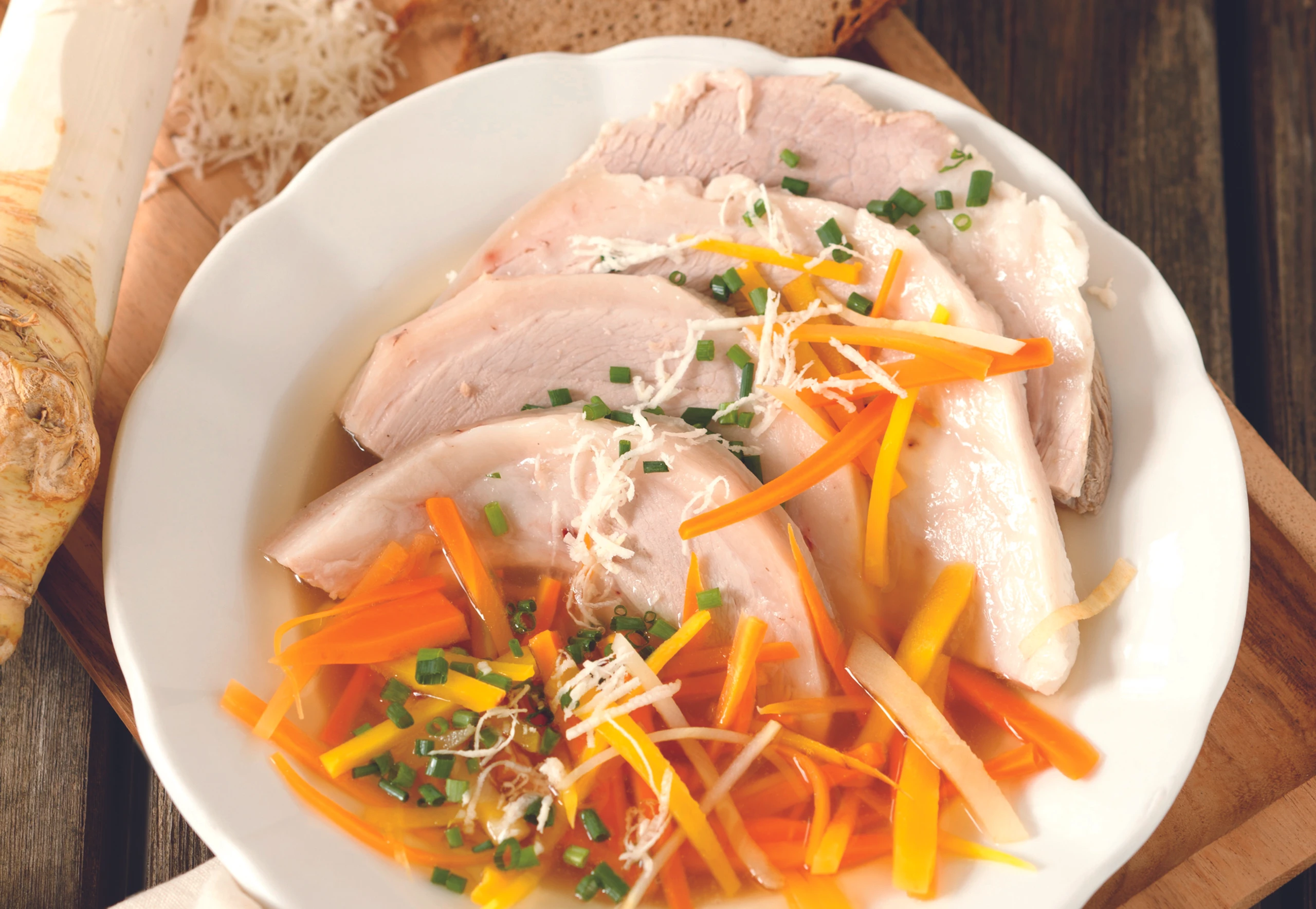 Schnittlauch fein schneiden. Stelzen aus dem Fond heben. Fleisch in Stücken vom Knochen schneiden, mit Gemüsestreifen anrichten und mit Kren und Schnittlauch bestreut servieren. Als Beilage passt Bauernbrot.