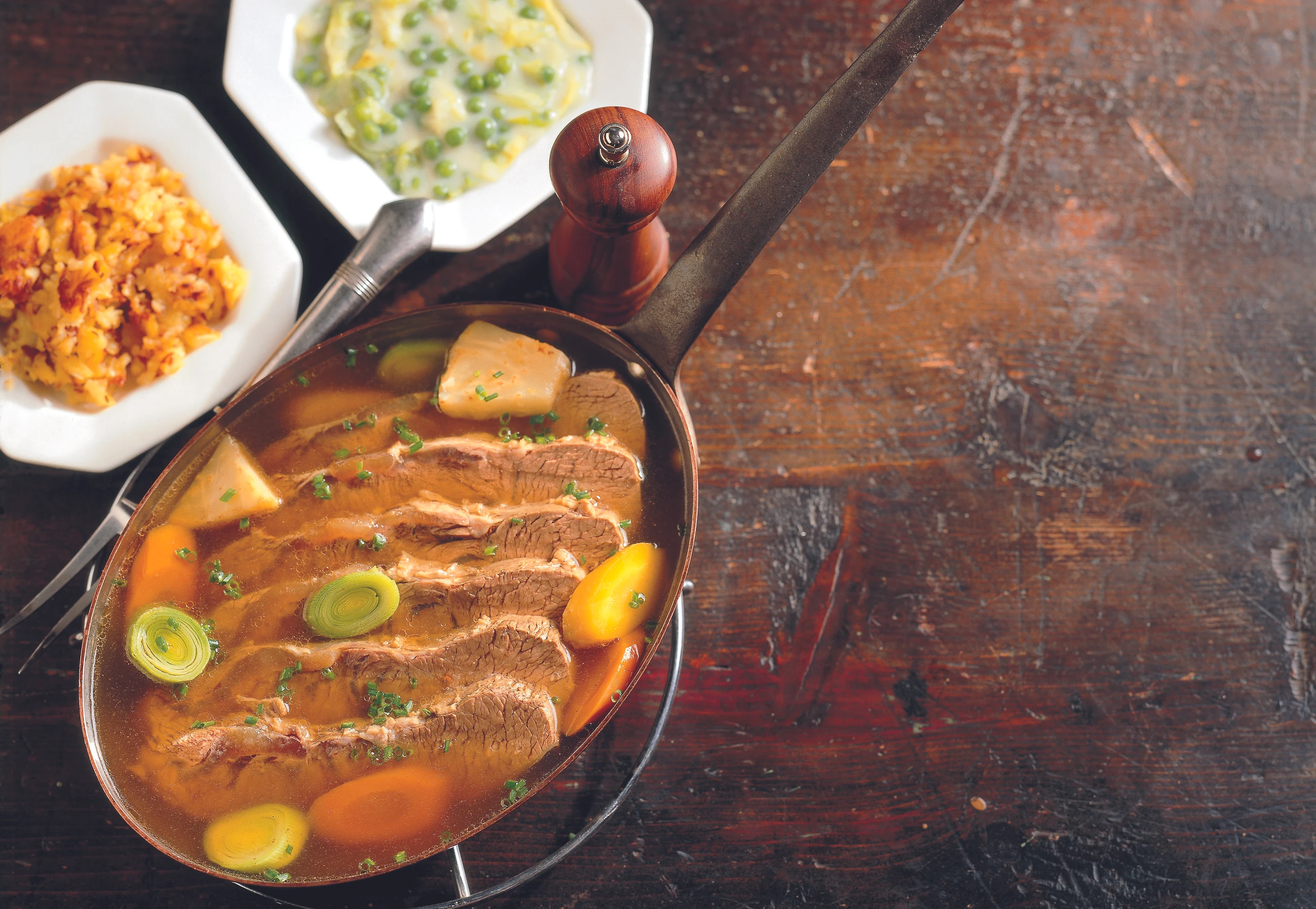 Wurzelwerk, Lauch, Zwiebeln und ein wenig Liebstöckel in die Suppe geben, Suppe weitere 45 Minuten köcheln. Gemüse und Fleisch aus der Suppe heben und in fingerdicke Scheiben schneiden.