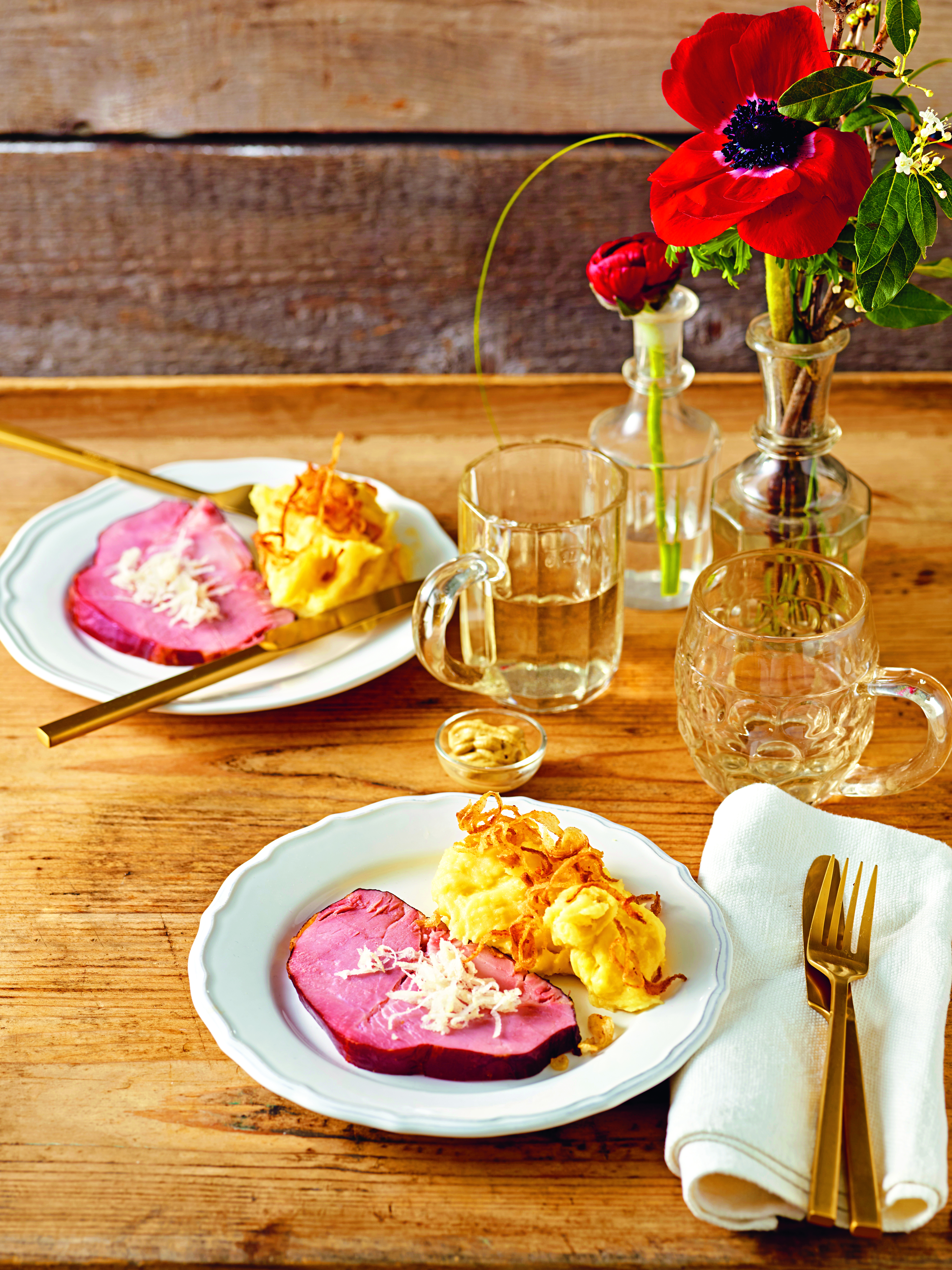 Selchschopf in Scheiben schneiden, mit Kren bestreuen und mit dem Erdäpfelpüree anrichten. Püree mit Röstzwiebeln garnieren.