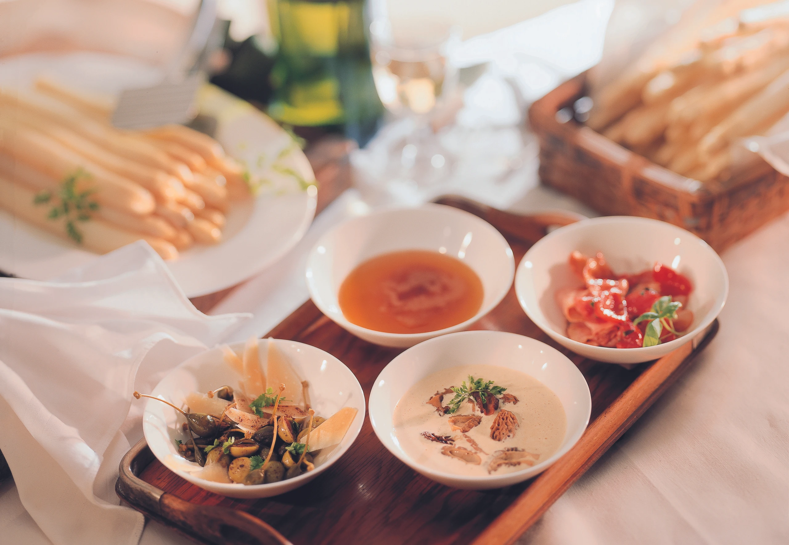 Spargel aus dem Kochfond heben, gut abtropfen lassen und auf einer vorgewärmten Platte anrichten. Spargel mit den Beilagen servieren. Wird der Spargel nicht sofort serviert, Spargel aus dem Kochfond heben, in kaltem Wasser abschrecken und gut abtropfen lassen. Spargel vor dem Servieren in heißem Kochfond erwärmen.