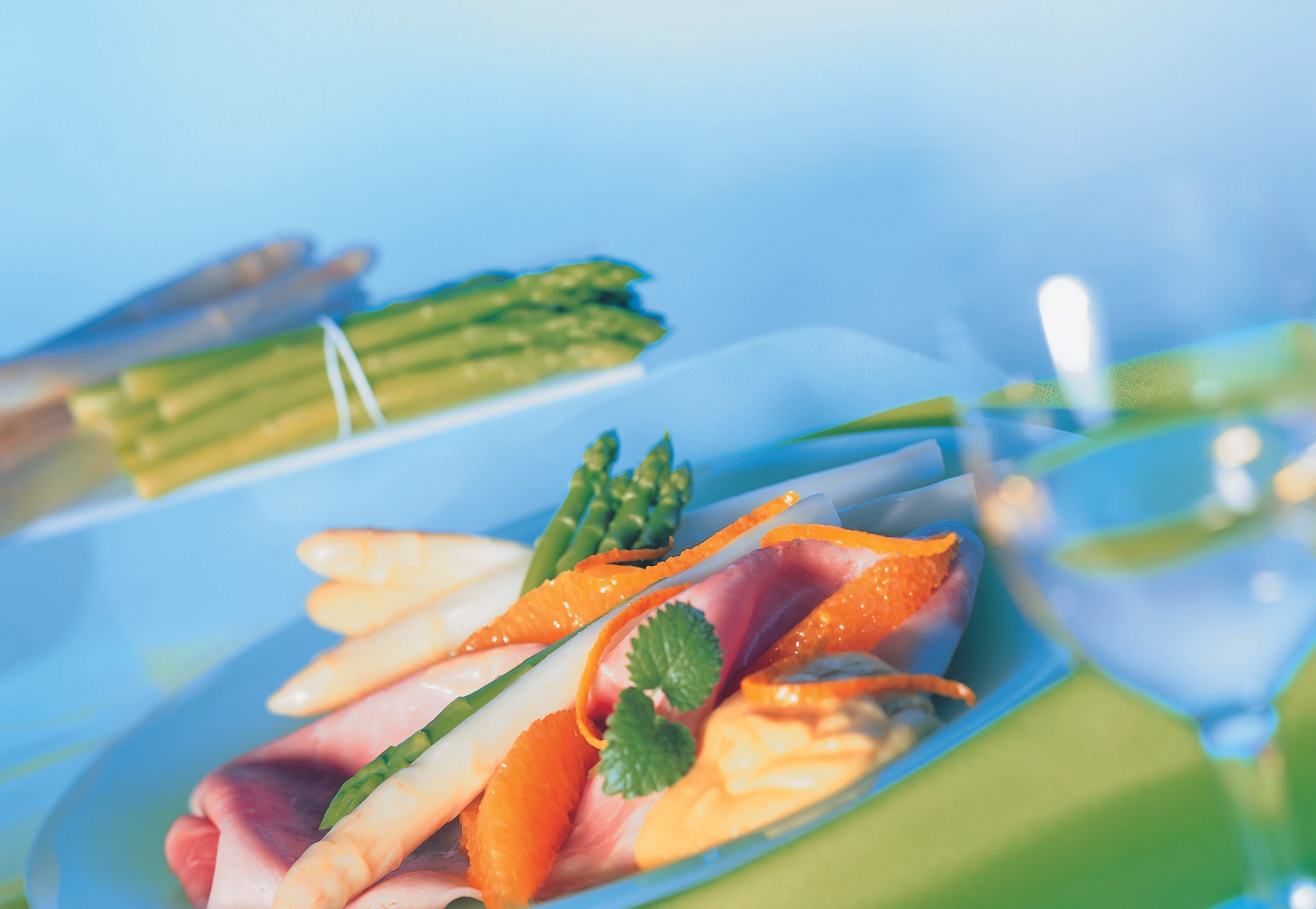 Zum Anrichten ein wenig Wasser mit ca. 1 EL Butter erhitzen, Spargel darin erwärmen, salzen und mit Schinken, der Orangen-Hollandaise (siehe Rezept) servieren. Spargel eventuell mit Orangenfilets, in Streifen geschnittener Orangenschale und Minzeblättern garnieren.