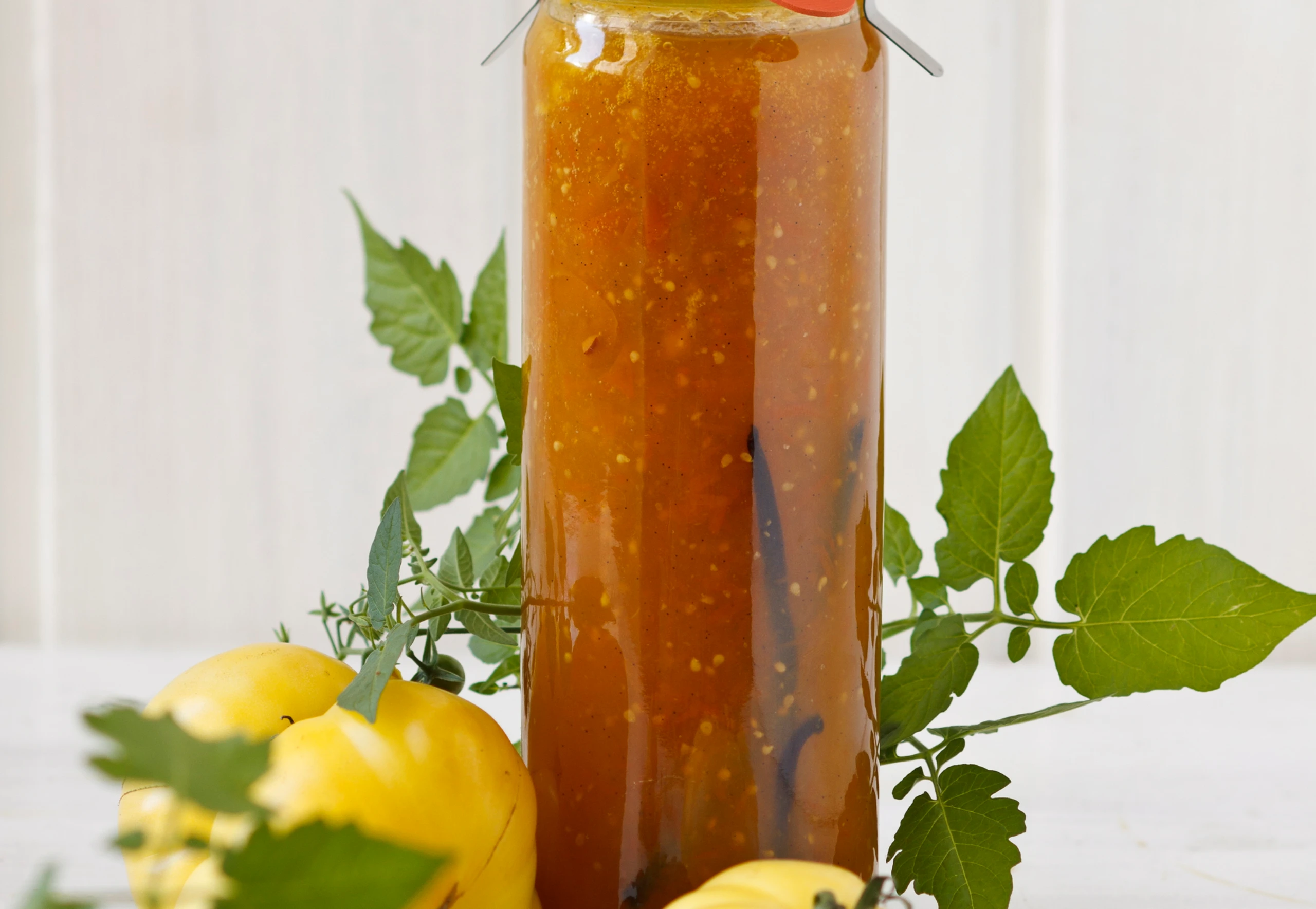 Vanilleschote längs halbieren, Mark herauskratzen. Paradeiser in einen Becher füllen, mit dem Stabmixer fein pürieren. Püree mit übrigem Zucker, Zitronensaft, Vanilleschote und Vanillemark in einen Topf geben und dick einkochen (ca. 40 Minuten).