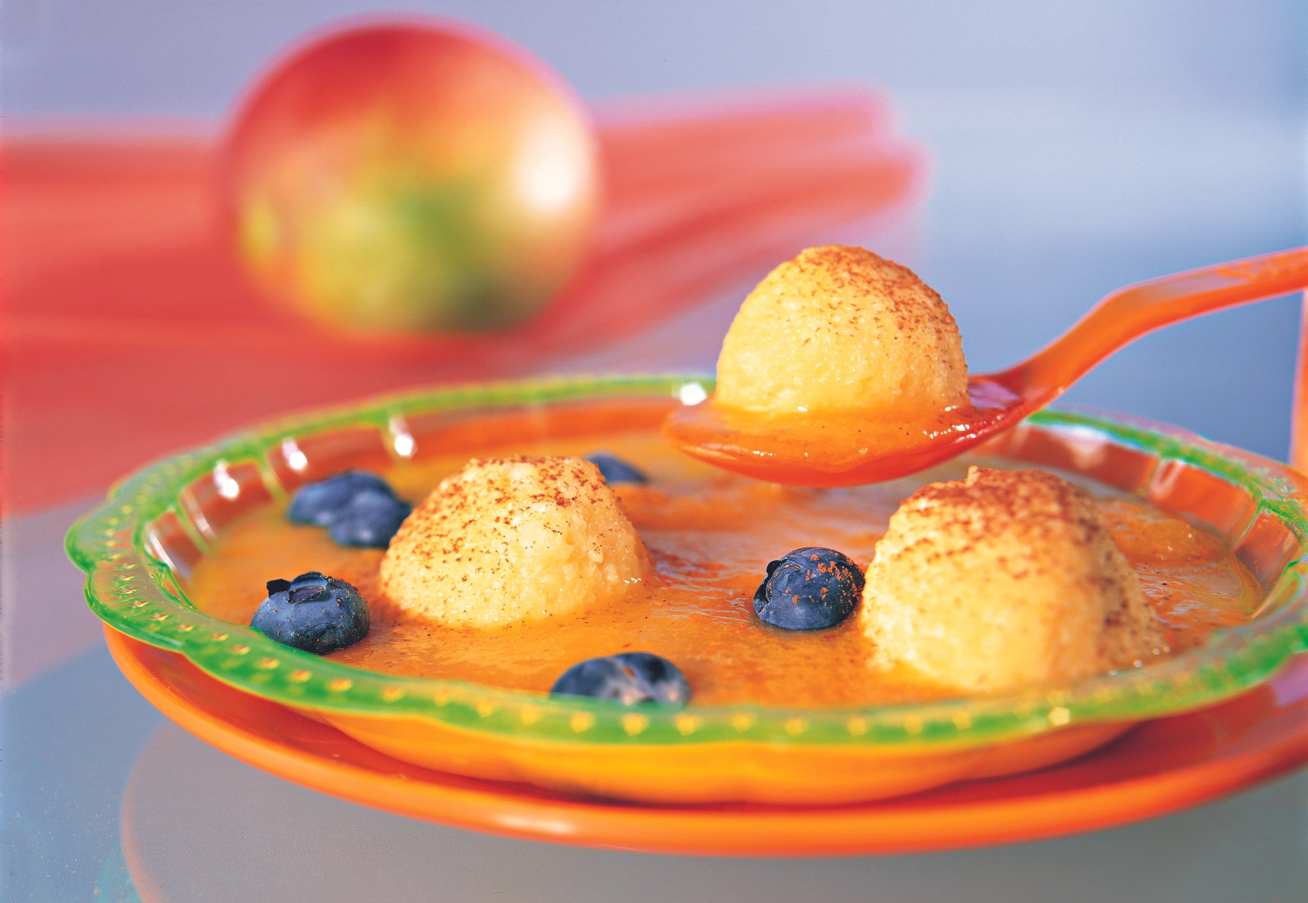 Salzwasser aufkochen. Mit feuchten Händen Bällchen (Ø 2 cm) aus der Grießmasse formen und im schwach kochenden Wasser 8–10 Minuten ziehen lassen. Mango schälen und mit Orangen- und Zitronensaft pürieren. Bällchen herausheben und kurz abtropfen lassen. Mit Sauce und Heidelbeeren anrichten.