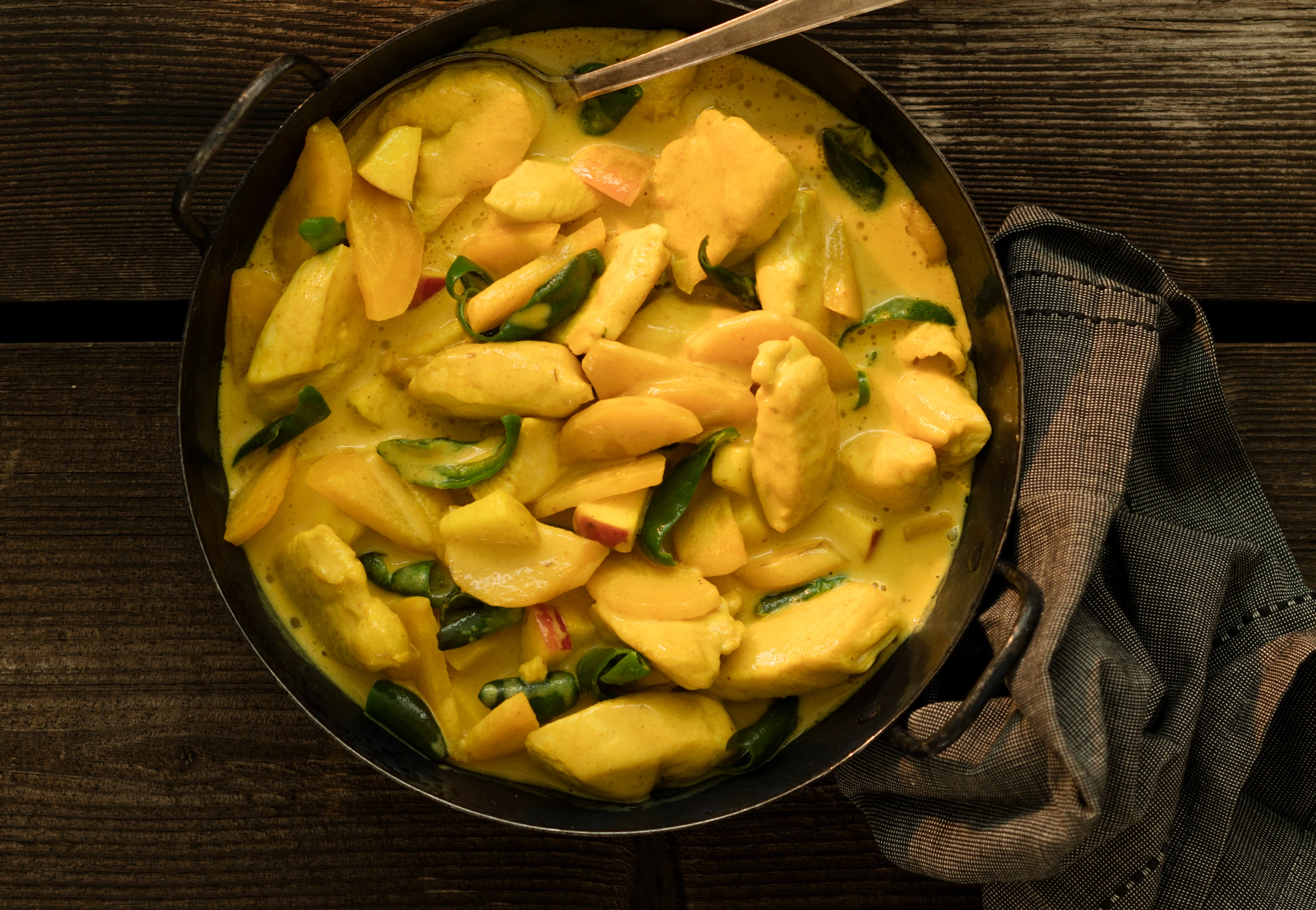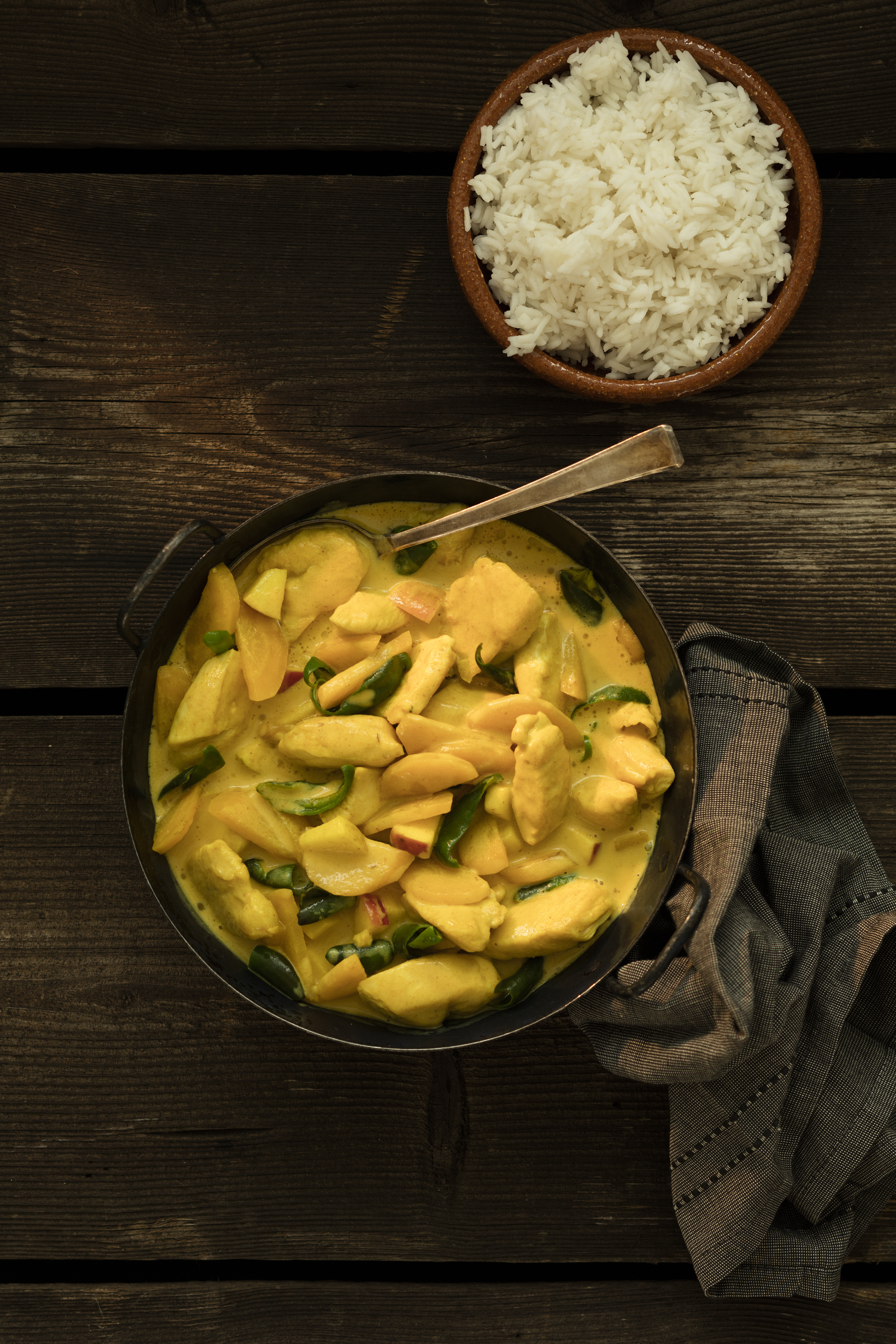 Hühnerfleisch und Apfelstücke zugeben, Curry salzen und mit Basmatireis servieren.