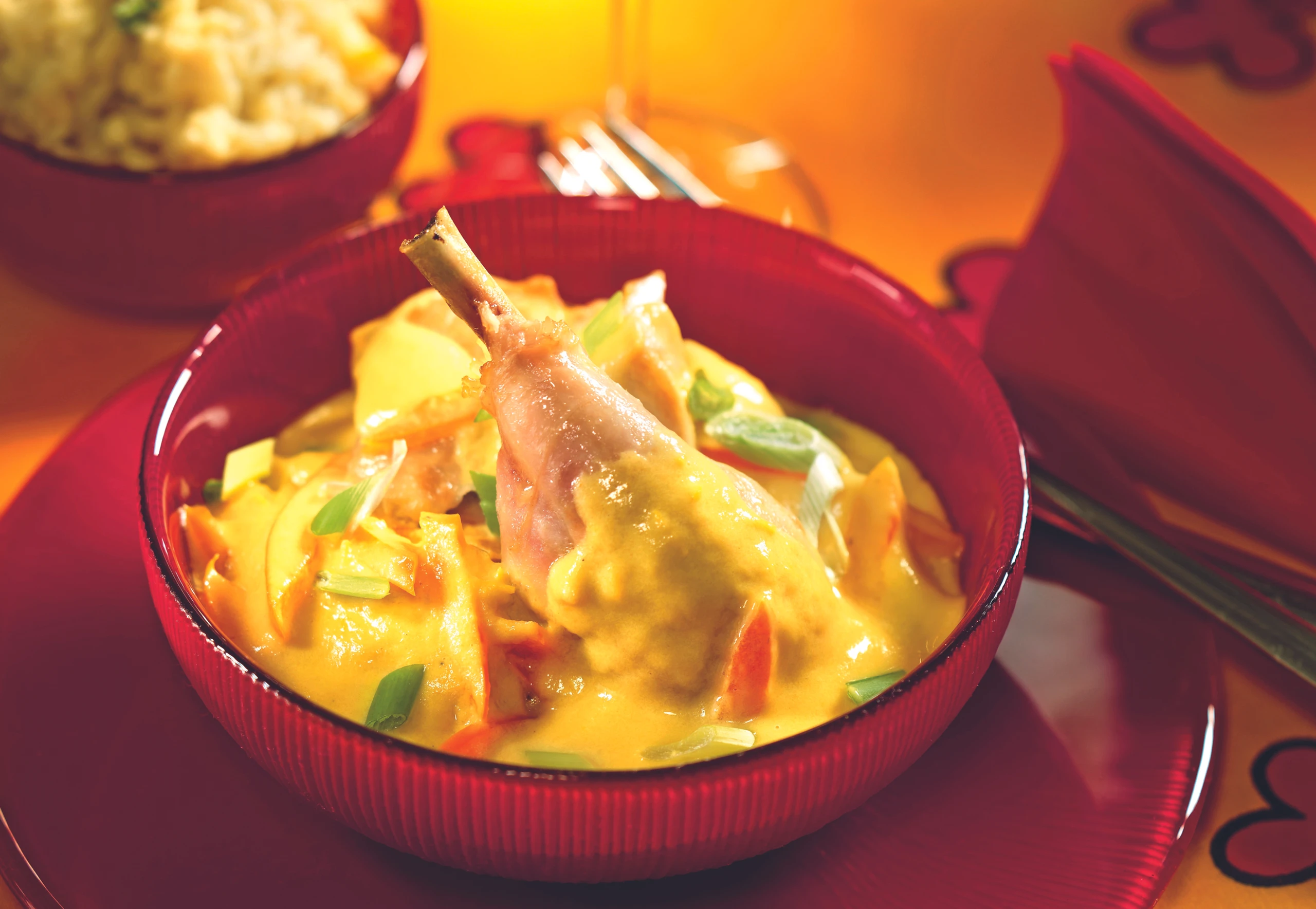 - Hühnerkeulen und -brüste enthäuten. Brüste halbieren, Keulen im Gelenk durchschneiden. Fleisch salzen und pfeffern, in Olivenöl rundherum anbraten, herausnehmen und beiseite stellen. Zwiebeln schälen und klein würfelig schneiden. Paprika putzen, in Stücke schneiden. Paprika und Zwiebeln im Bratfett anschwitzen. Kurkuma zugeben, mit Suppe ablöschen. Salzen und pfeffern, Obers zugießen und das Gemüse weich dünsten.