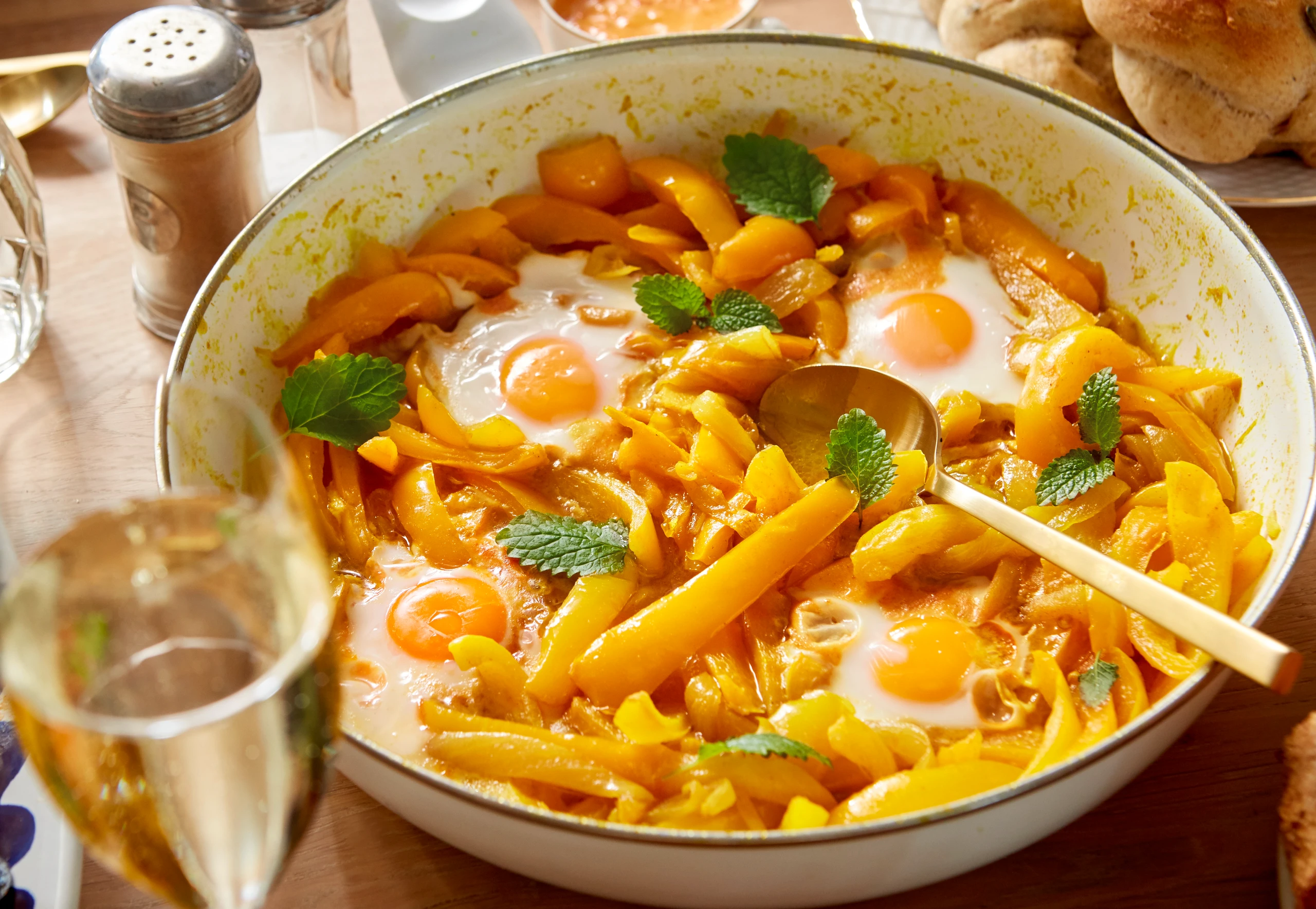 Im Gemüse 4 Mulden formen und die Eier hineinschlagen. Pfanne abdecken und bei schwacher Hitze ca. 6 Minuten garen. Die Dotter sollen noch weich sein. Minzeblättchen vor dem Servieren darüber streuen.