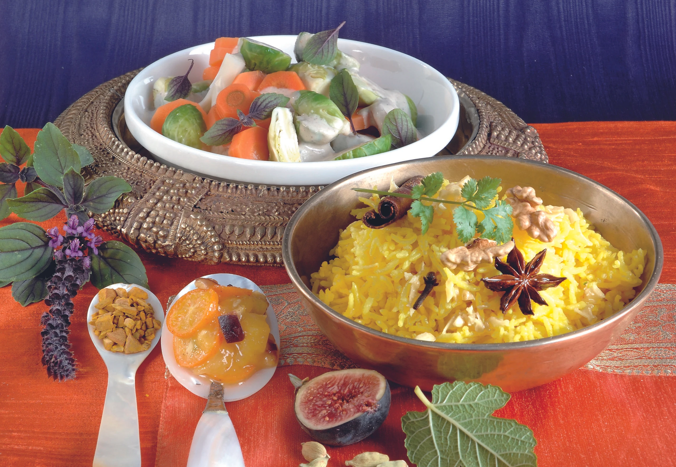 - In einem flachen Topf Ghee erhitzen. Nelken, Muskat, Sternanis und Zimtstange darin anrösten. Reis und Ingwer zugeben, unter Rühren kurz braten. Einweichwasser zugießen, Kurkuma und Salz untermischen. Reis aufkochen, zudecken und bei milder Hitze in ca. 12 Minuten körnig weich garen.