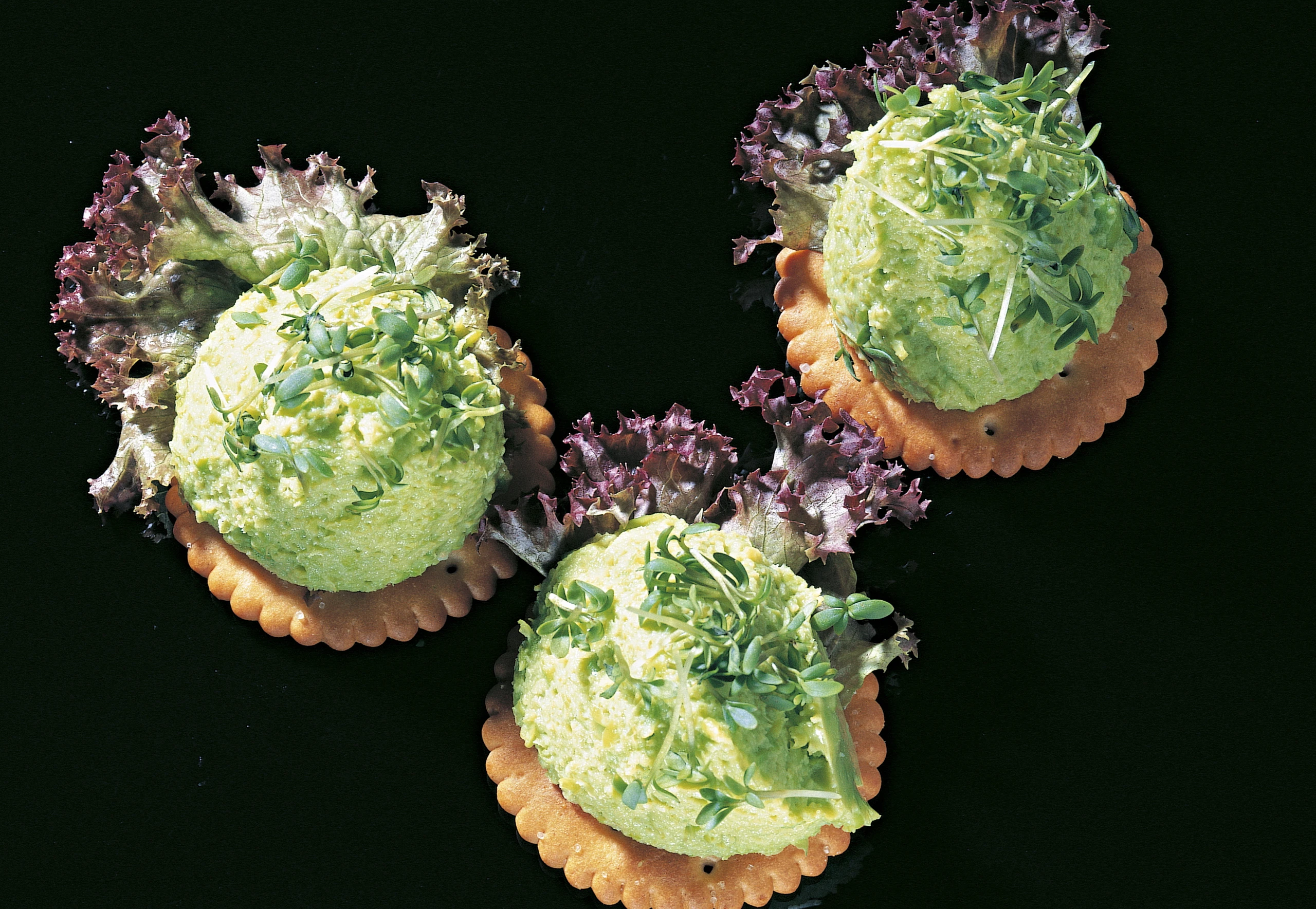Vor dem Servieren Kresseblättchen mit einer Schere von den Stielen schneiden. Mit einem Teelöffel Nockerln aus dem Erbsenmus ausstechen, auf die Cracker setzen und mit Kresseblättchen garnieren.