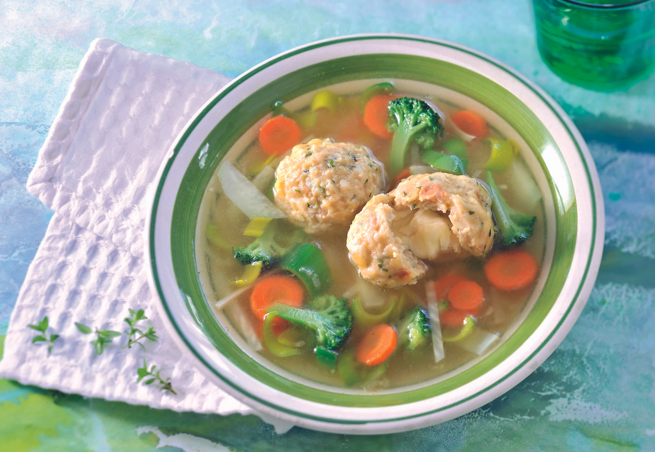 Parallel dazu Öl in einem beschichteten Topf erhitzen, Zwiebel darin goldbraun anbraten. Suppe zugießen und aufkochen. Karotten, Kohlrabi, Petersilwurzeln und Sellerie zugeben und 6 Minuten köcheln. Lauch und Brokkoli zugeben und das Gemüse weitere 6 Minuten köcheln. Suppe mit Salz und Pfeffer abschmecken, mit den Knödeln servieren.