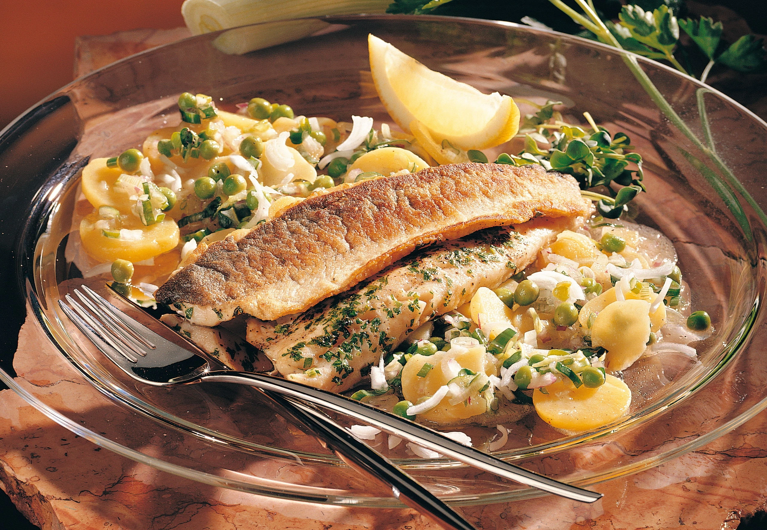 Gemüse-Erdäpfelsalat mit gebratenem Forellenfilet