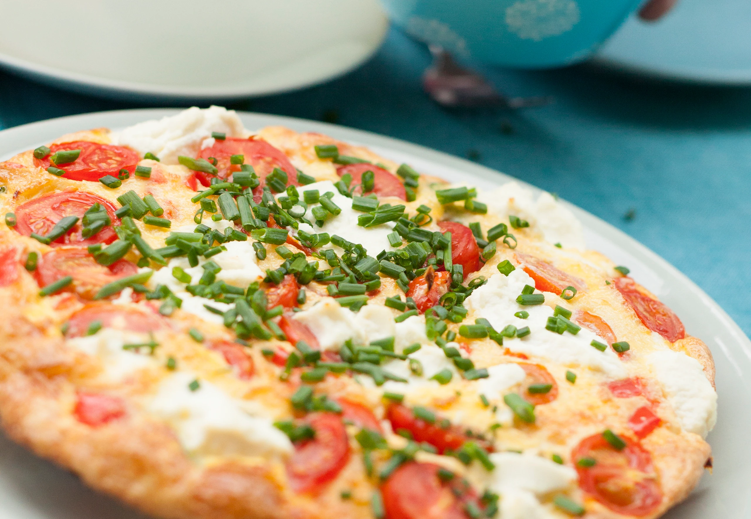 Frittata mit Paradeisern (Schnittfläche oben) belegen, Ricotta flöckchenweise darauf verteilen.