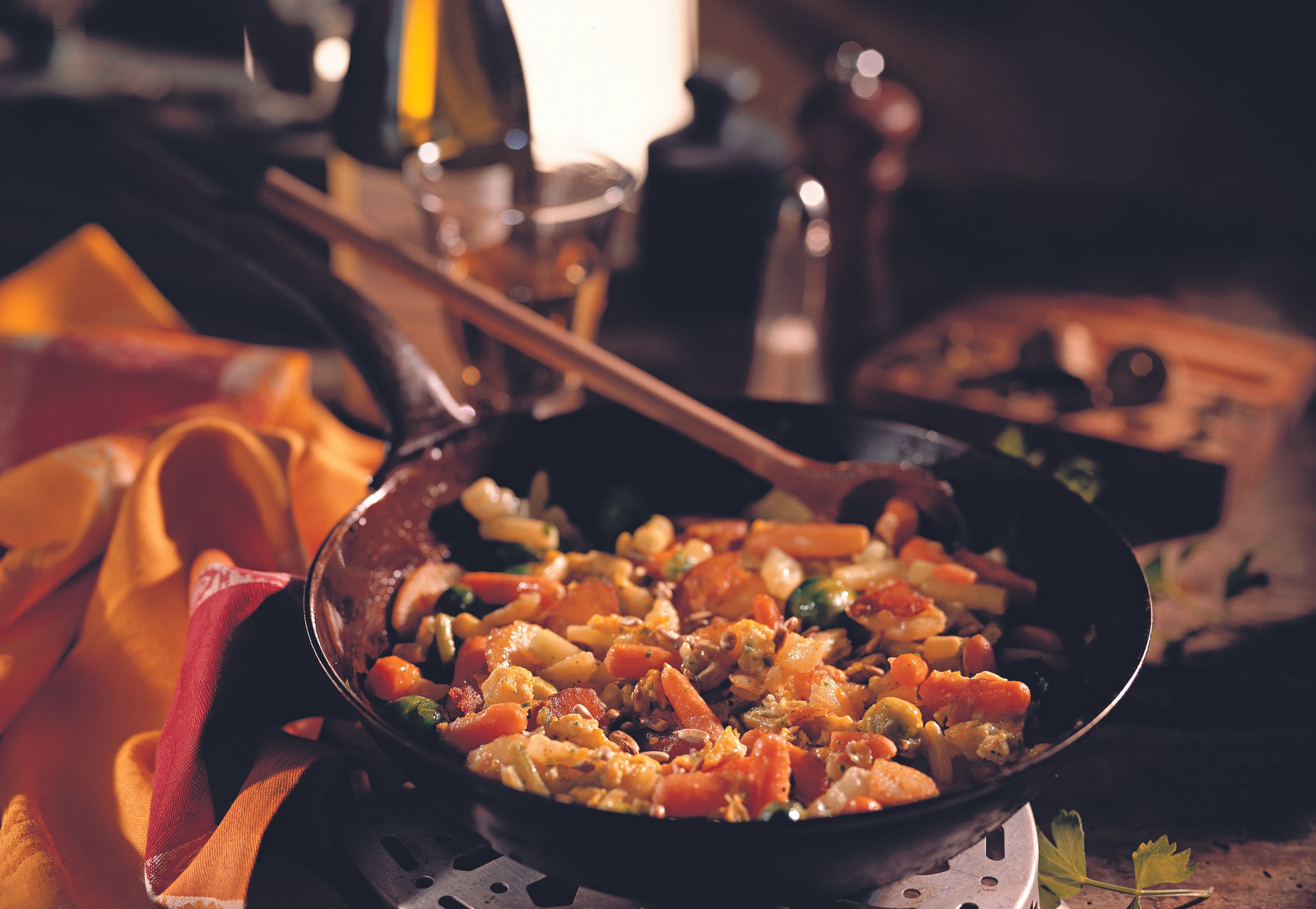 Gemüse-Gröstel mit Ei und Sonnenblumenkernen