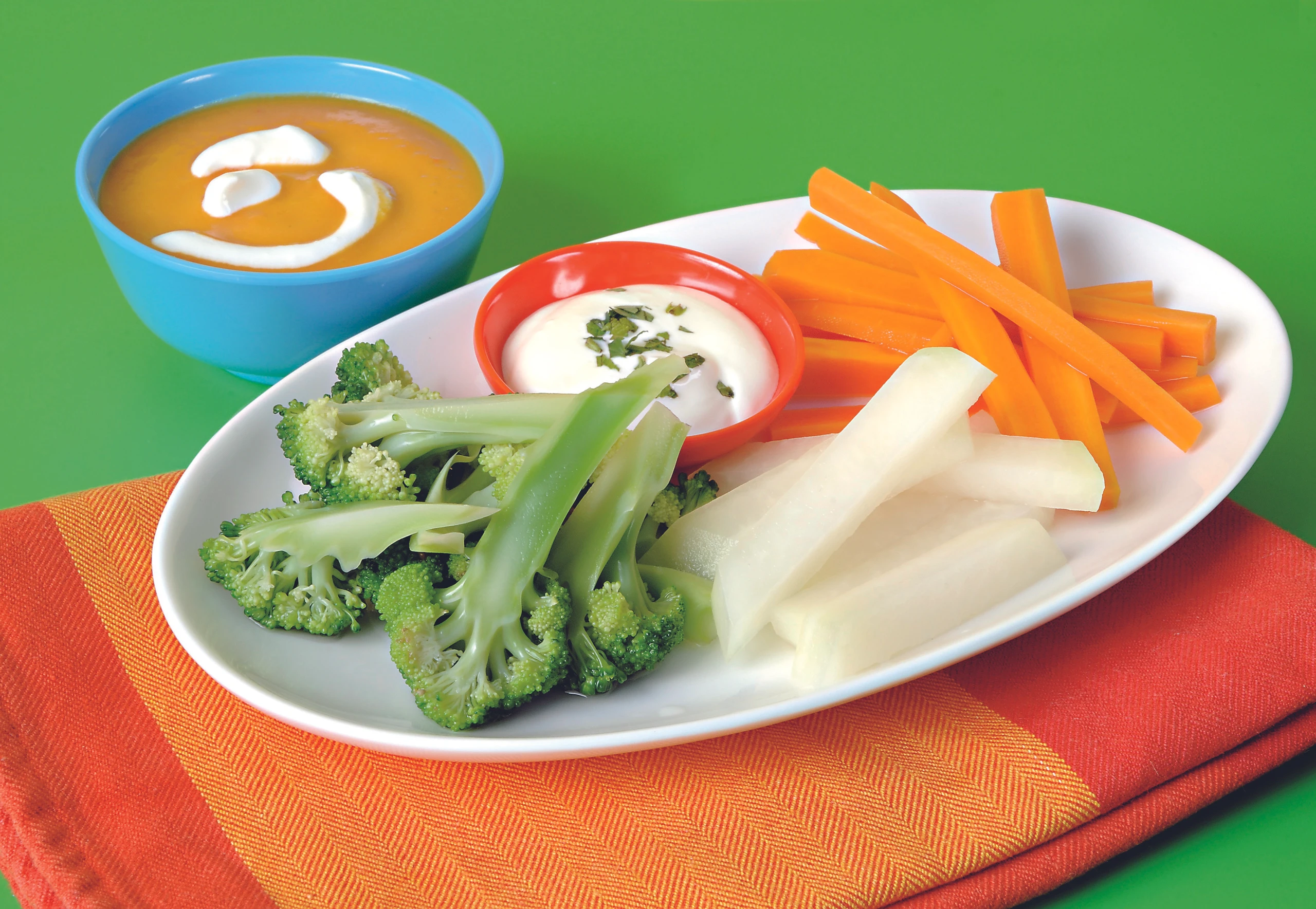 Gemüse nach Sorten getrennt anrichten. Die Erdäpfel-Paprikasauce und / oder den Joghurt-Rahm-Dip dazu reichen.