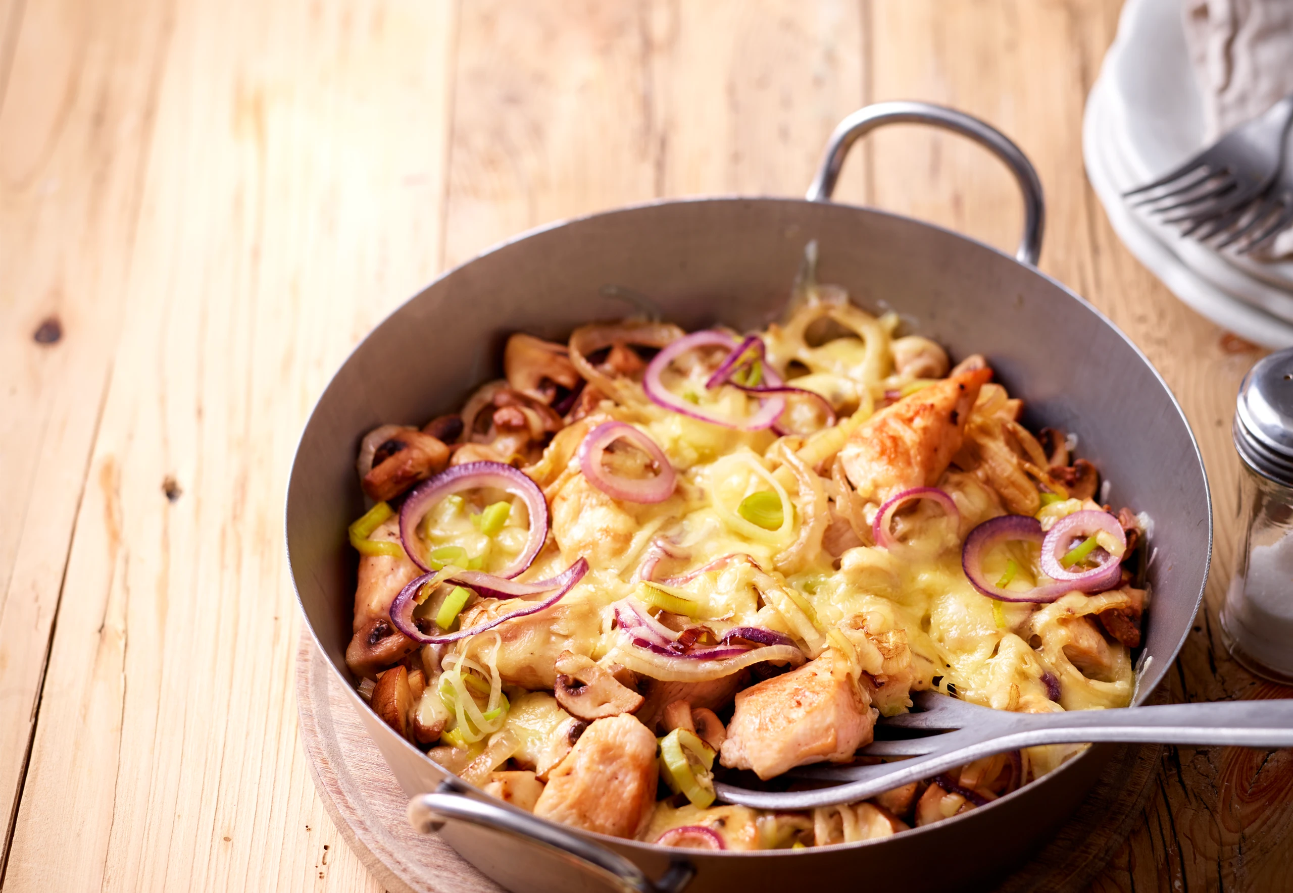 Hühnerfleisch mit Salz und Pfeffer würzen, in 5 EL Öl rundum anbraten und aus der Pfanne nehmen. Im Bratrückstand Zwiebeln und Champignons anrösten. Lauch zugeben und kurz mitbraten. Fleisch unterrühren. Mischung mit Suppe aufgießen, mit Salz, Pfeffer und Muskat würzen und ca. 10 Minuten dünsten.