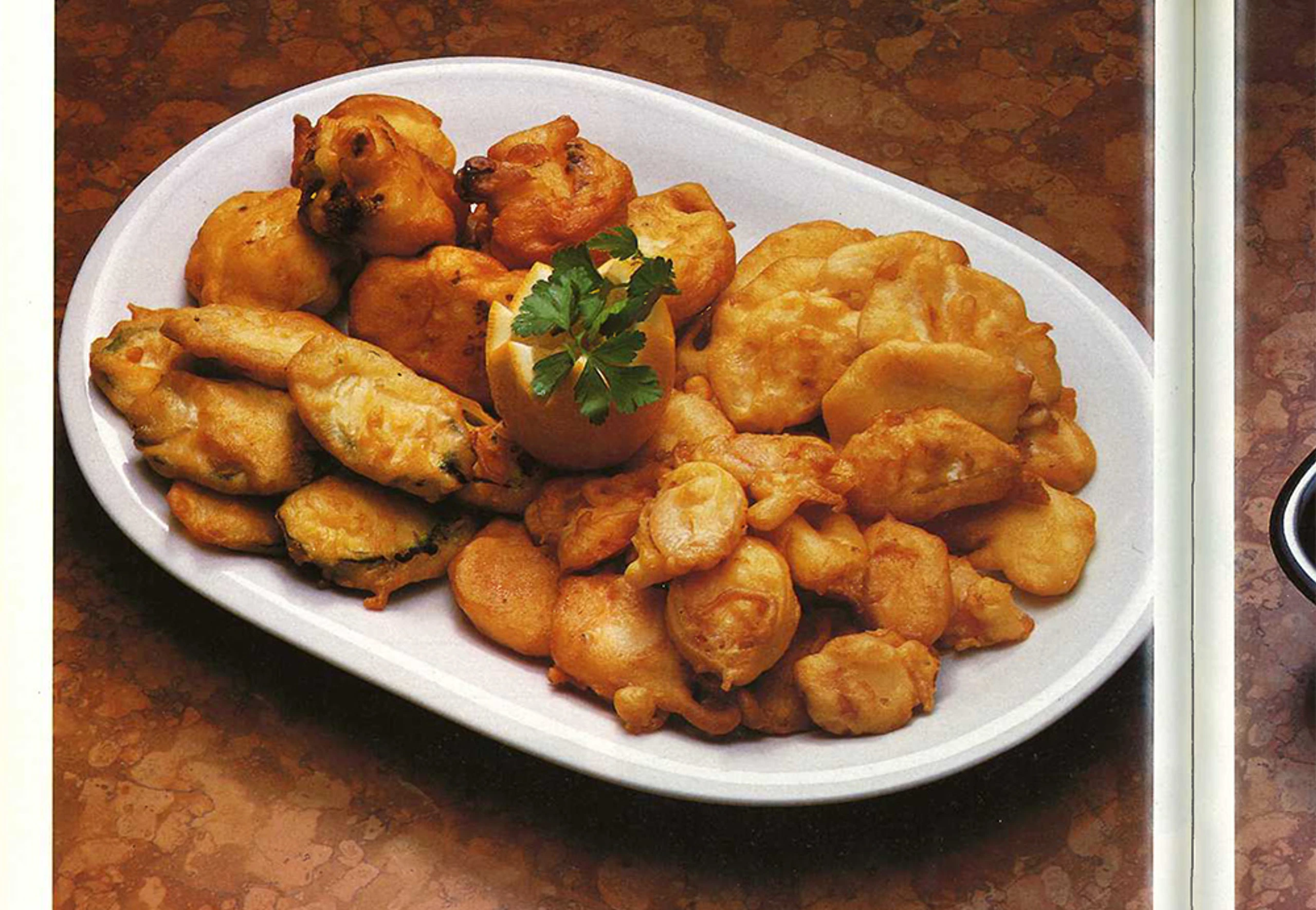 Gemüse salzen, dann einzeln durch den Backteig ziehen und sogleich ins heiße Backfett legen. Auf schwacher Hitze langsam zu goldgelber Farbe backen. Abtropfen lassen, mit Zitronenstücken und Petersilie garniert anrichten. Dazu kann eine beliebige kalte Sauce gereicht werden, zum Beispiel Sauce Tartare oder Sauce Remoulade.