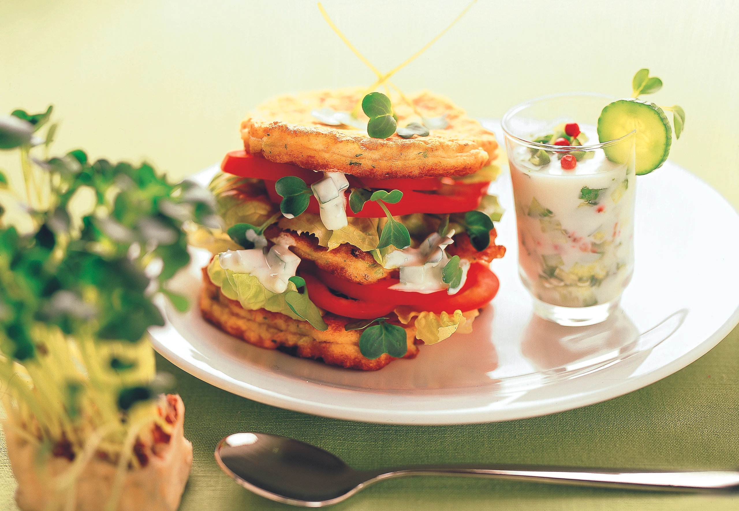 Gemüse-Joghurt-Blinis mit Kresse-Gurken-Dip