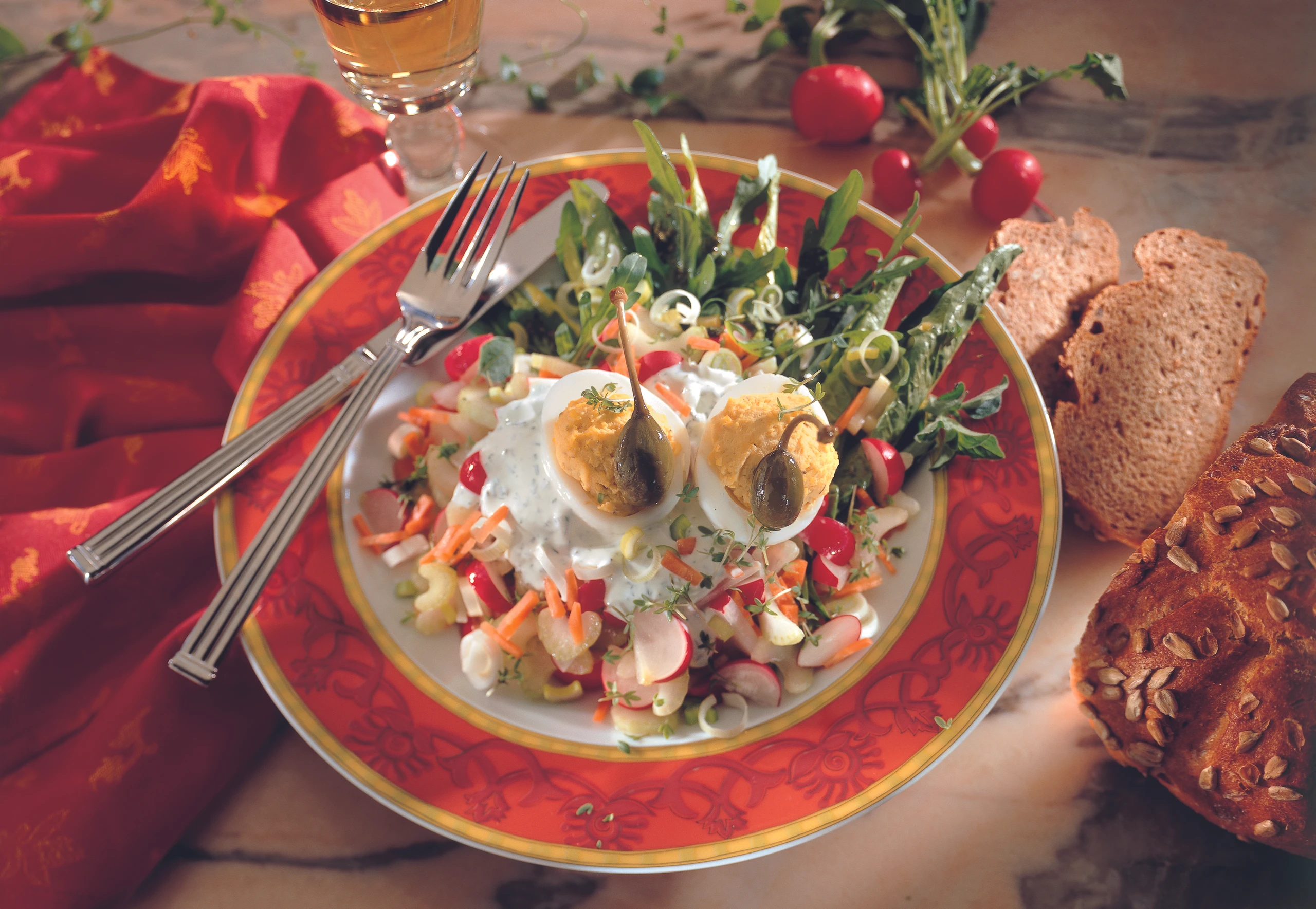 Gemüsesalat auf Tellern anrichten, mit Rahm-Marinade beträufeln und mit den gefüllten Eiern garnieren.