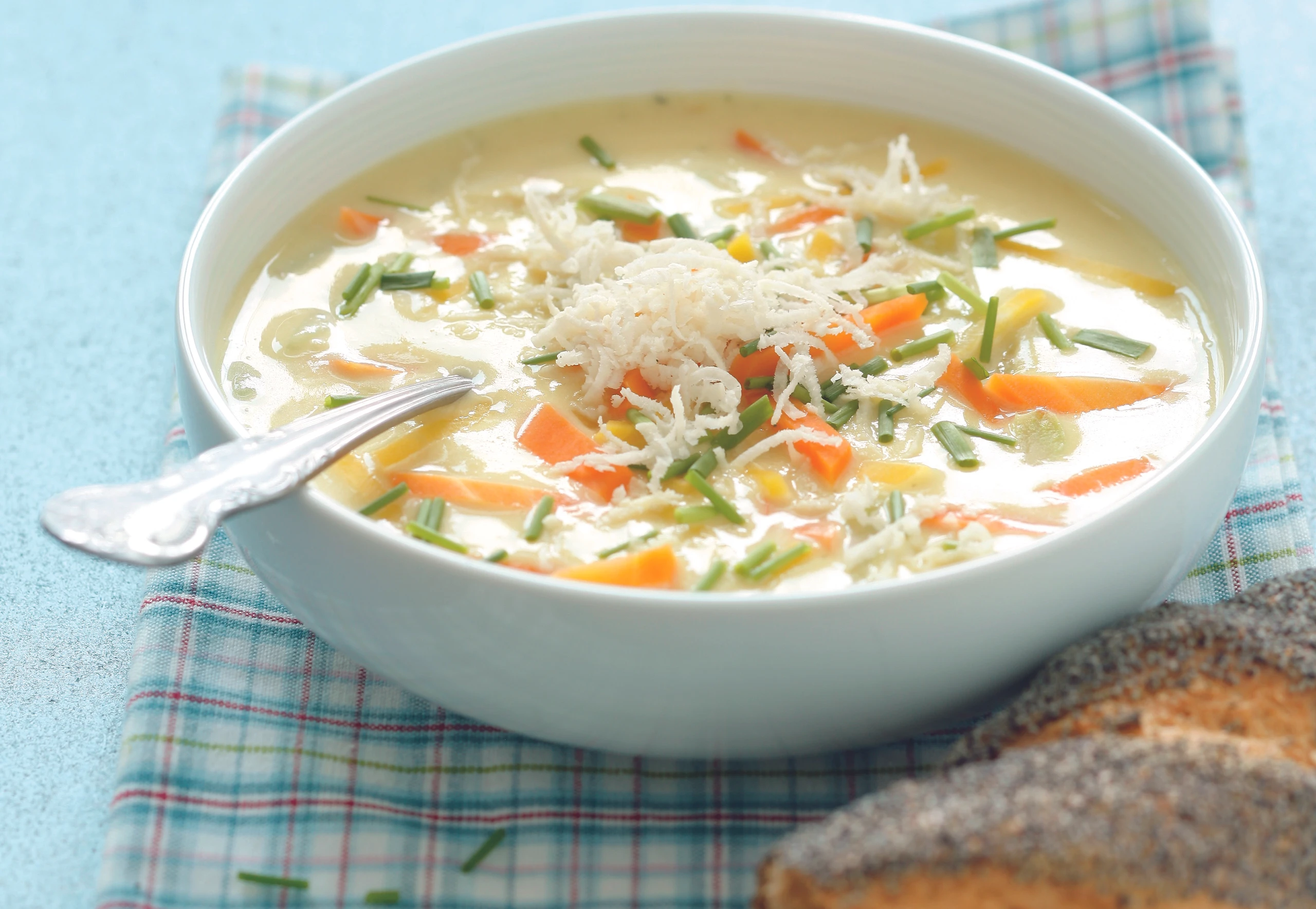 Gemüse und Erdäpfel schälen. Gemüse in kurze, dünne Streifen schneiden. Erdäpfel in 1 cm große Stücke schneiden und in Butter anschwitzen. Suppe zugießen, aufkochen, Erdäpfel bei schwacher Hitze weich köcheln (ca. 20 Minuten). Inzwischen Gemüse in Salzwasser bissfest kochen. Abseihen, abschrecken und gut abtropfen lassen.