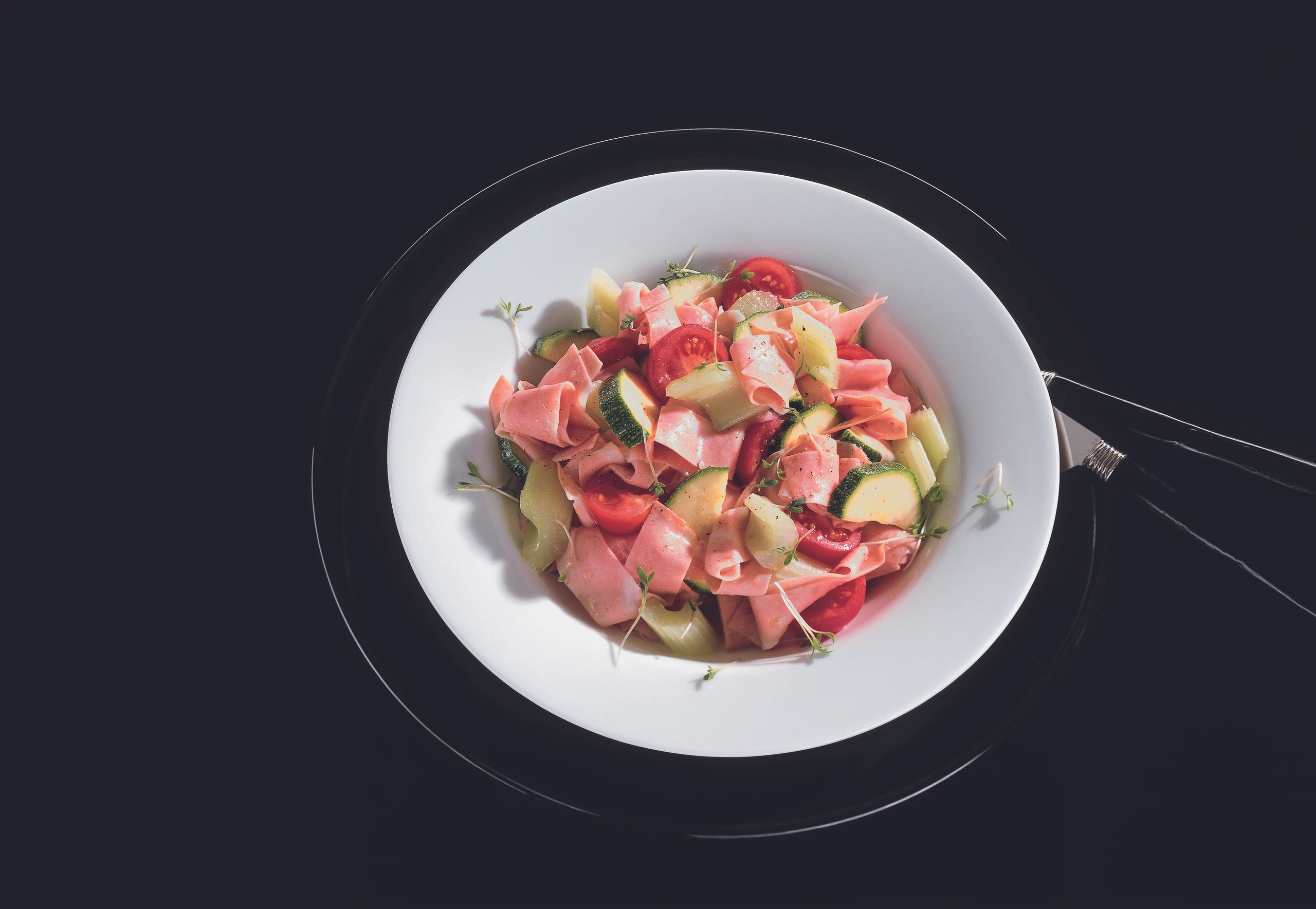 Paradeiser je nach Größe halbieren oder vierteln. Selleriestangen dünn schälen und in ca. 1 cm lange, schräge Stücke schneiden. Zucchini der Länge nach halbieren, quer in 1/2 cm dicke Scheiben schneiden. Mortadella in ca. 2 cm breite Streifen schneiden. Kresseblättchen von den Stielen schneiden.