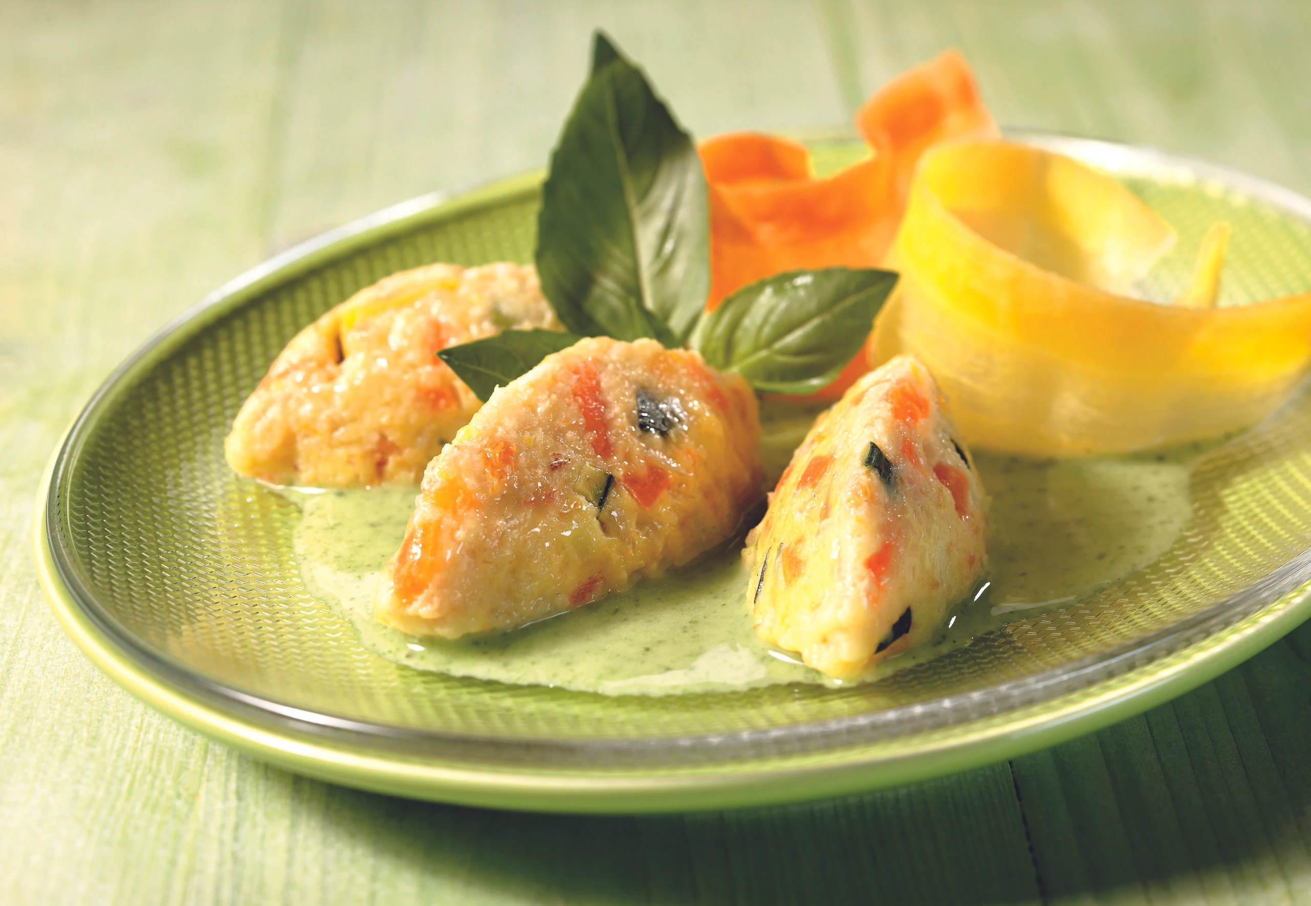- Mehl in Butter anschwitzen, Fond und Obers zugießen und ca. 5 Minuten köcheln, dabei ständig rühren. Basilikum 1 Minute in der Sauce ziehen lassen, pürieren und salzen.
