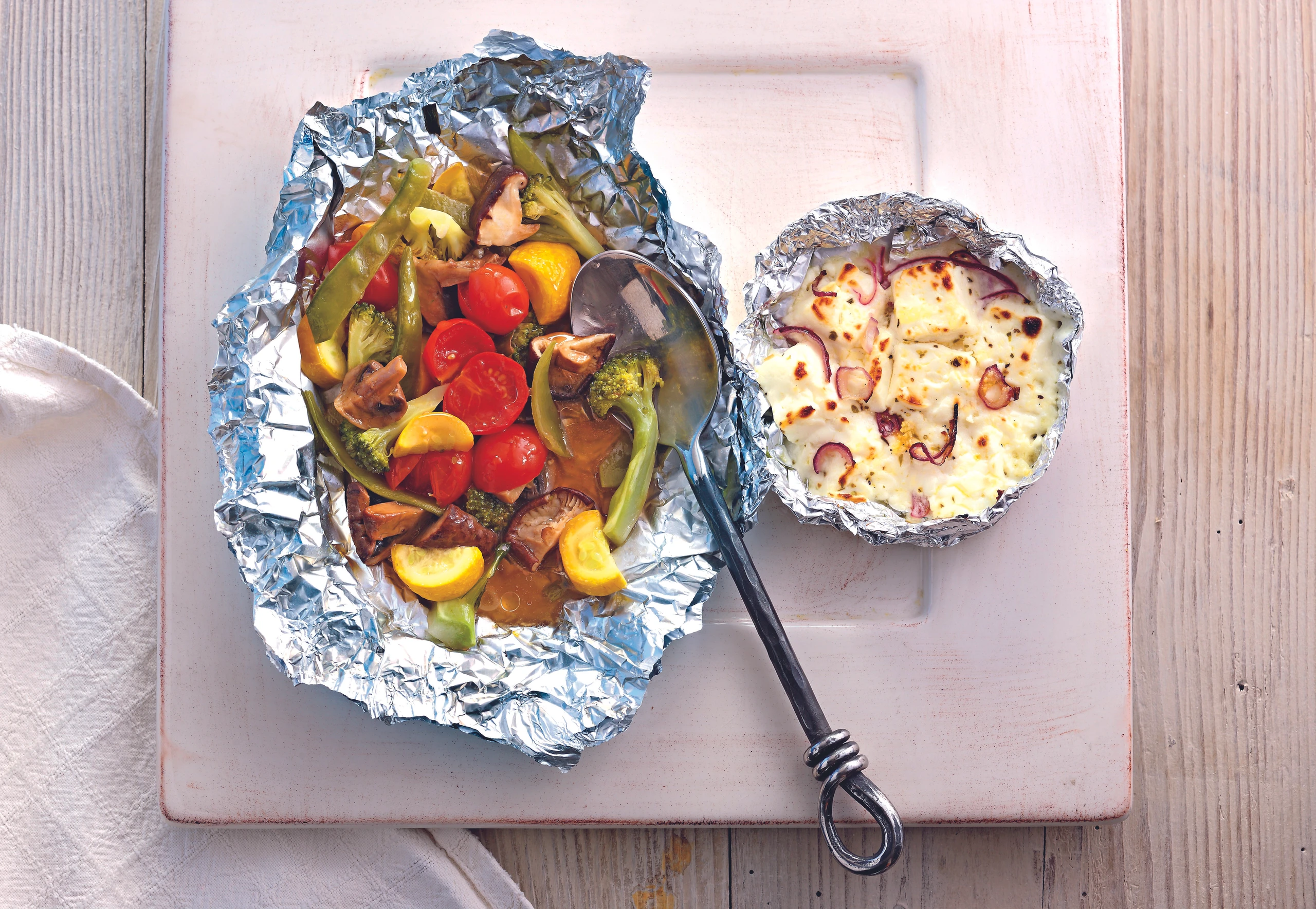 - Zwiebel schälen und in feine Ringe schneiden. Schafkäse in kleine Würfel schneiden.Aus Alufolie 4 kleine Tassen formen. Käse einfüllen, mit Zwiebeln und Oregano bestreuen, mit Olivenöl beträufeln. Käse die letzten 7 Minuten zu den Gemüsepäckchen ins Rohr geben.
