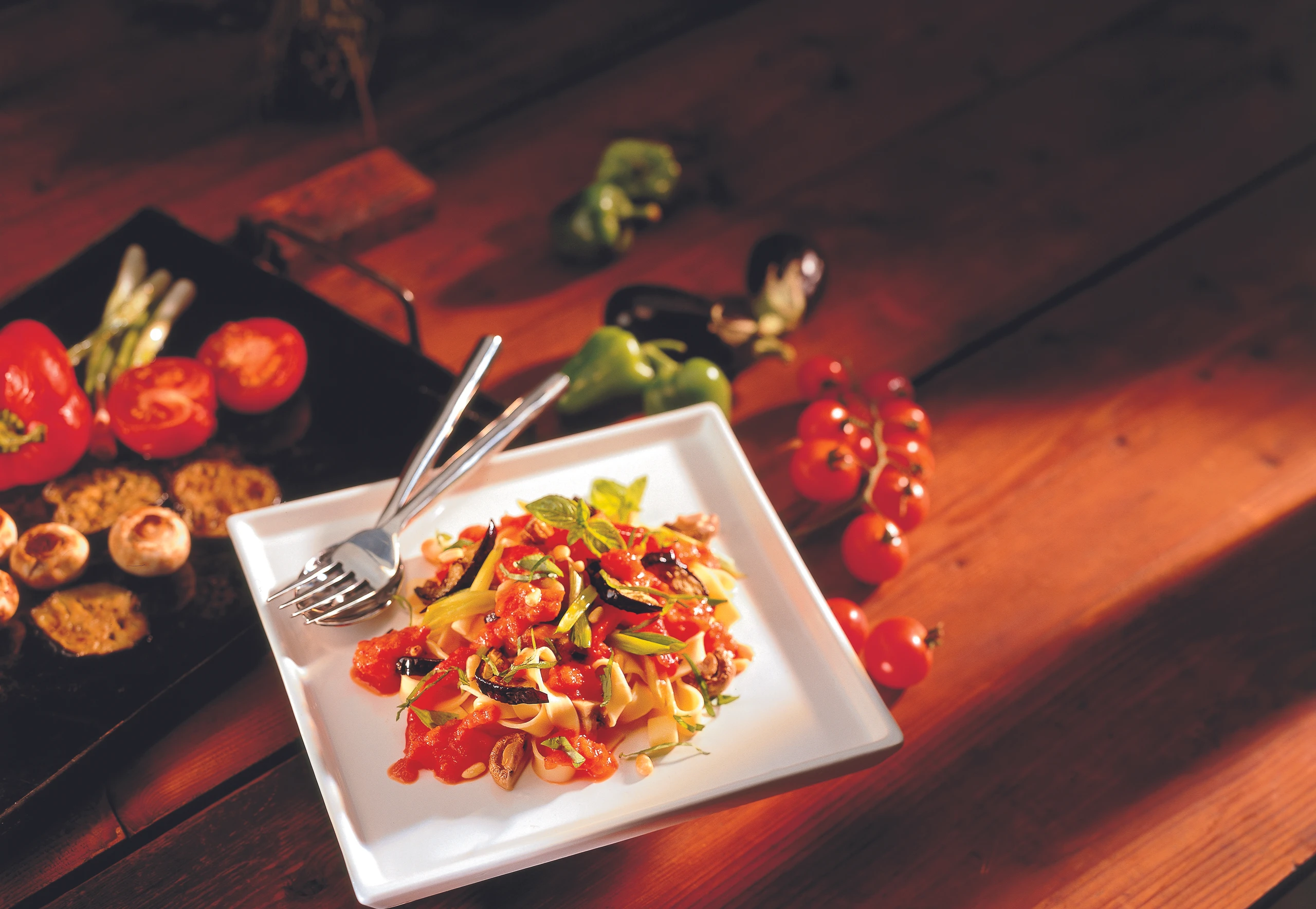 Melanzani in 1 cm dicke Längsstreifen schneiden, Paradeiser halbieren, Jungzwiebeln längs halbieren, Pilze putzen. Knoblauch schälen, Basilikum in feine Streifen schneiden, Oregano hacken.