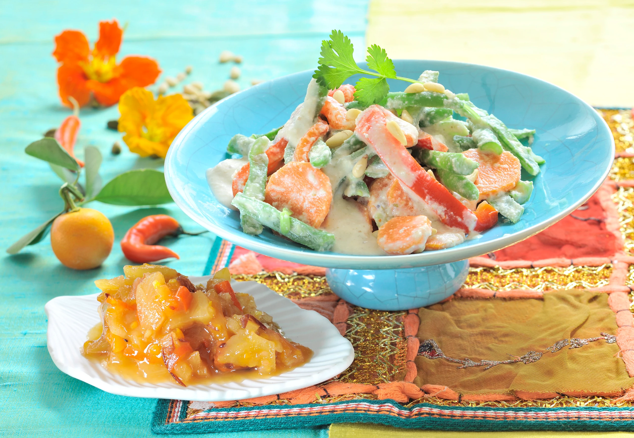 Gemüse in Pignolicreme mit Ananas-Mango-Chutney
