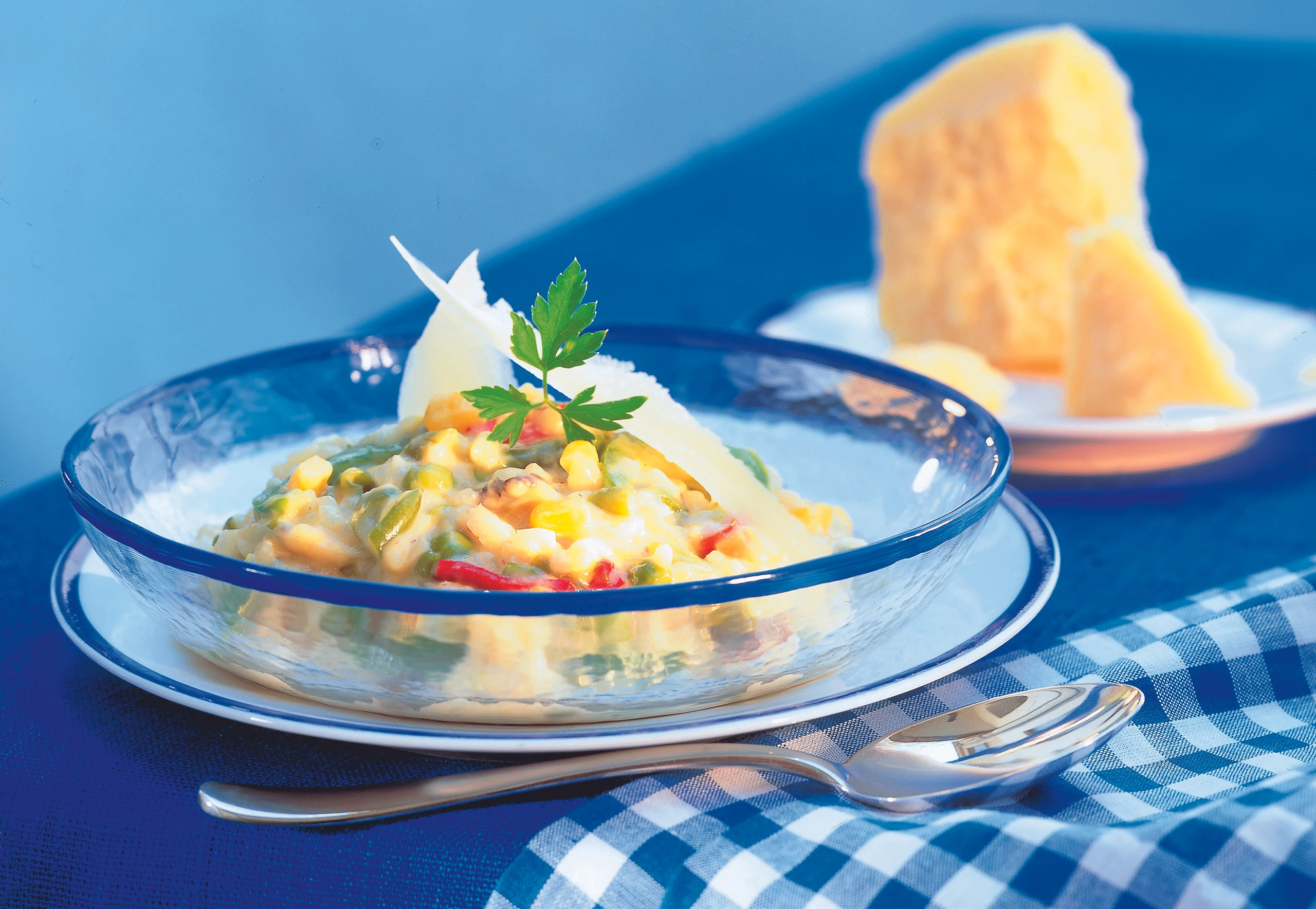 Gemüse (falls nötig) klein schneiden. Mit Zwiebeln und Knoblauch in Butter anschwitzen, vorgegarten Reis zugeben, nach und nach Gemüsesuppe zugießen. Reis bissfest garen. Zuletzt Parmesan, kalte Butter und Petersilie unterziehen und mit Salz abschmecken. Das Risotto soll cremig und die Reiskörner noch al dente sein.