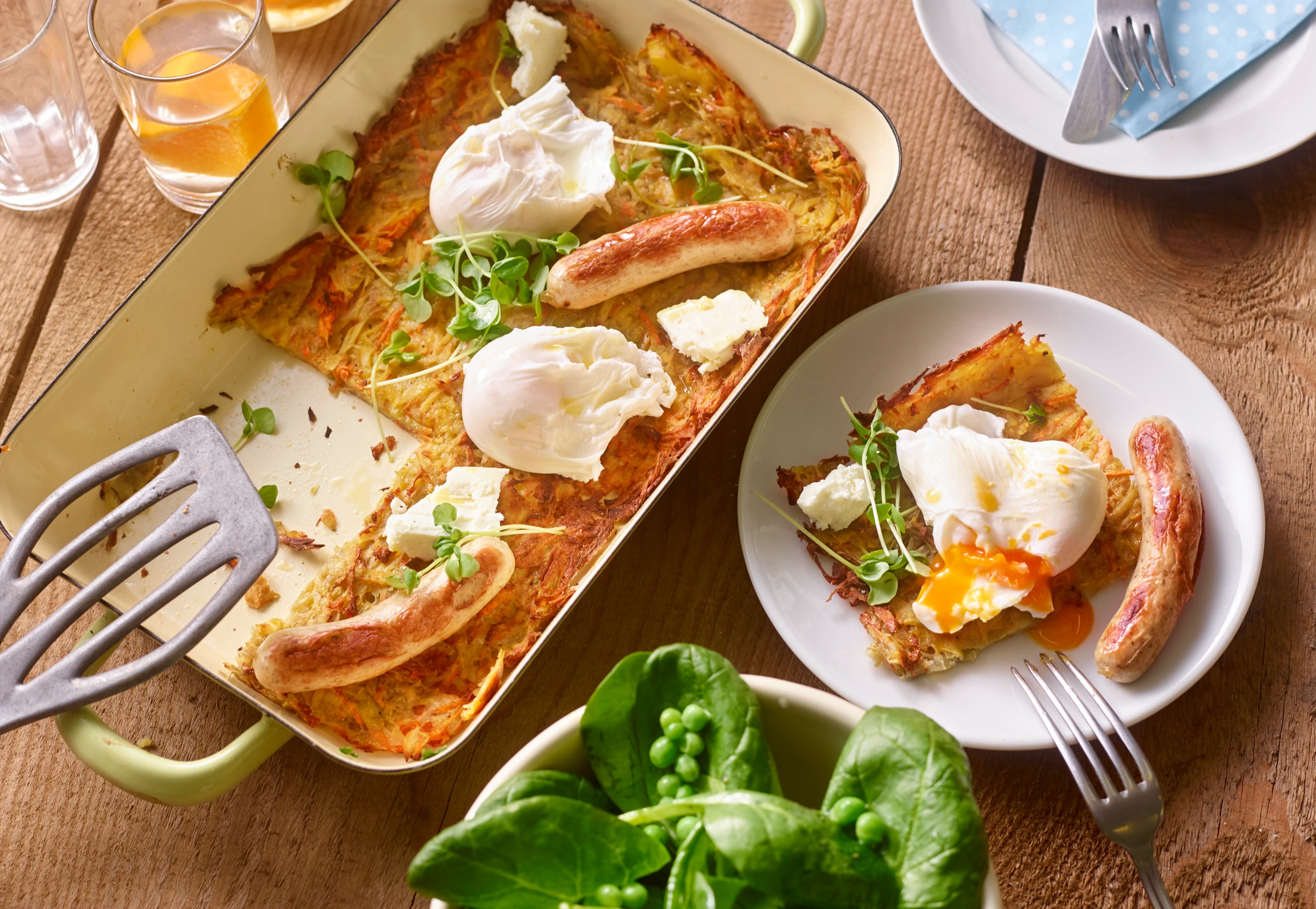 Spinatblätter mit dem Dressing und den Erbsen vermischen und mit dem Rösti servieren.